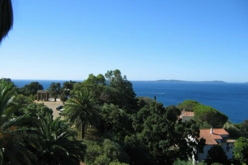 Air-conditioned 47 m² T2 apartment, renovated in 2023, located on the second floor of a villa. Quiet, leafy setting. Private terrace with panoramic sea view, facing Île du Levant.