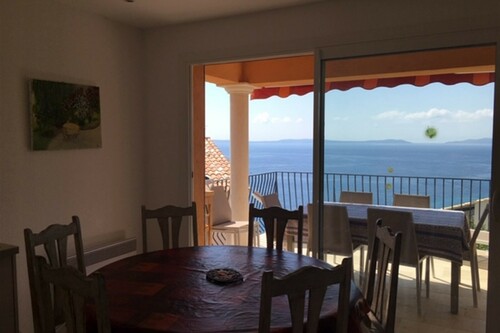 Air-conditioned T3 apartment with veranda, large terrace and lovely sea view in detached villa close to shops and 500 m from beach.