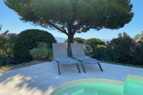 Located in Sainte Maxime, the accommodation offers an exceptional view of the sea in a park of several hectares full of flowers and tranquility, with a swimming pool and deckchairs.