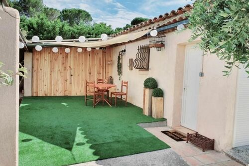 Quiet, in a residential area of the seaside resort of Sainte-Maxime, 1.8km from the beach and 400m from local shops (supermarket 2km). Set of 4 accommodations including this cottage with its independent entrance, reserved car location and small enclosed private land (51m²). We appreciate the covered terrace with its garden furniture, the garden armchairs to sunbathe in the green square. Charcoal barbecue available.