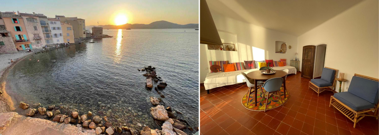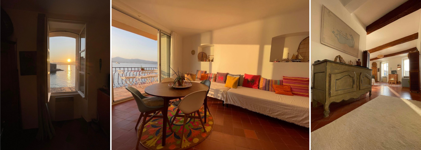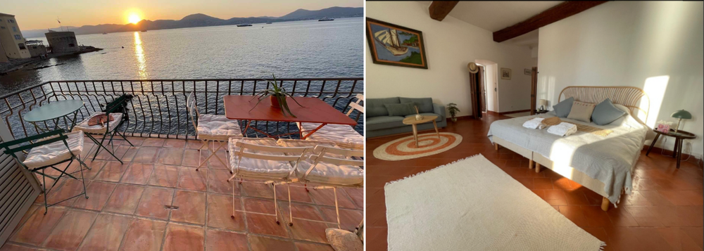 It comprises two large rooms/bedrooms. The first has a large double bed and a sofa. Two windows overlook a small beach. And at sunset, the play of light and shadow decorates the room... In the other room, which opens directly onto the terrace and the sea, two single beds can also be used as benches for reading or watching the sea. The large bay window provides a cool breeze all day long. This room is also equipped with a mobile air conditioner for cooling.A unique place, in the tradition of authentic Saint Tropez, by Signac, Françoise Sagan or Boris Vian...