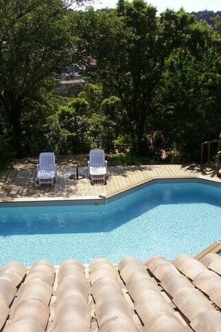 At 500m from the village. In the heart of chestnut trees, your room with terrace on the swimming-pool. View on the village and swimming-pool design made in wood.
