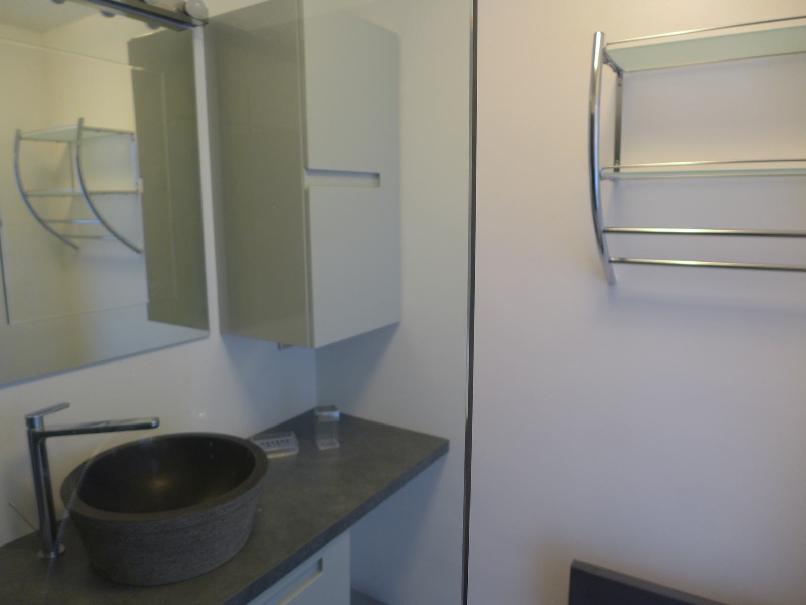 Entrance hall with large wardrobe. Living room opening onto the terrace with new sofa bed (140), excellent bedding, flat screen TV, TV and DVD, an extendable table and shelves.