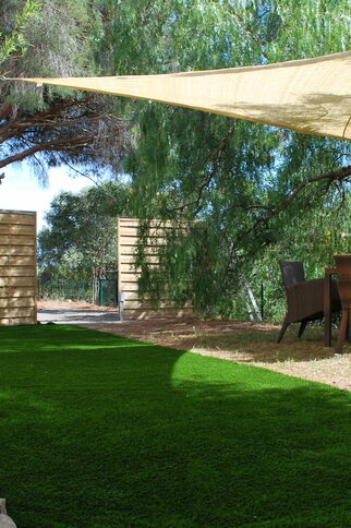 In the garden: balcony equipped with table, chairs, sun umbrella and deckchairs. Covered car park.