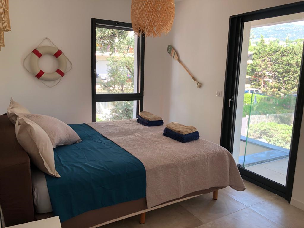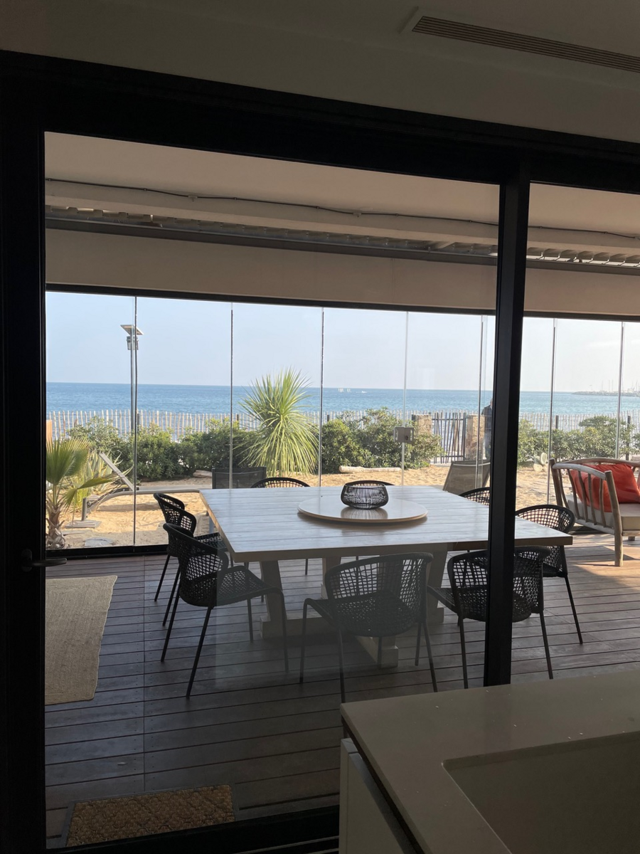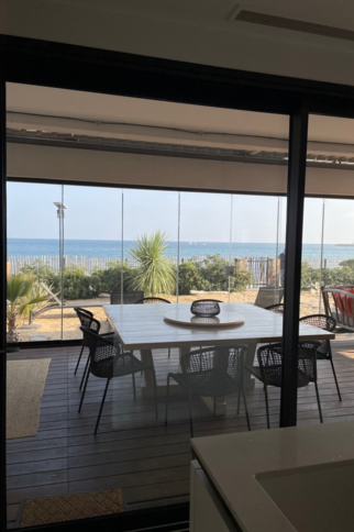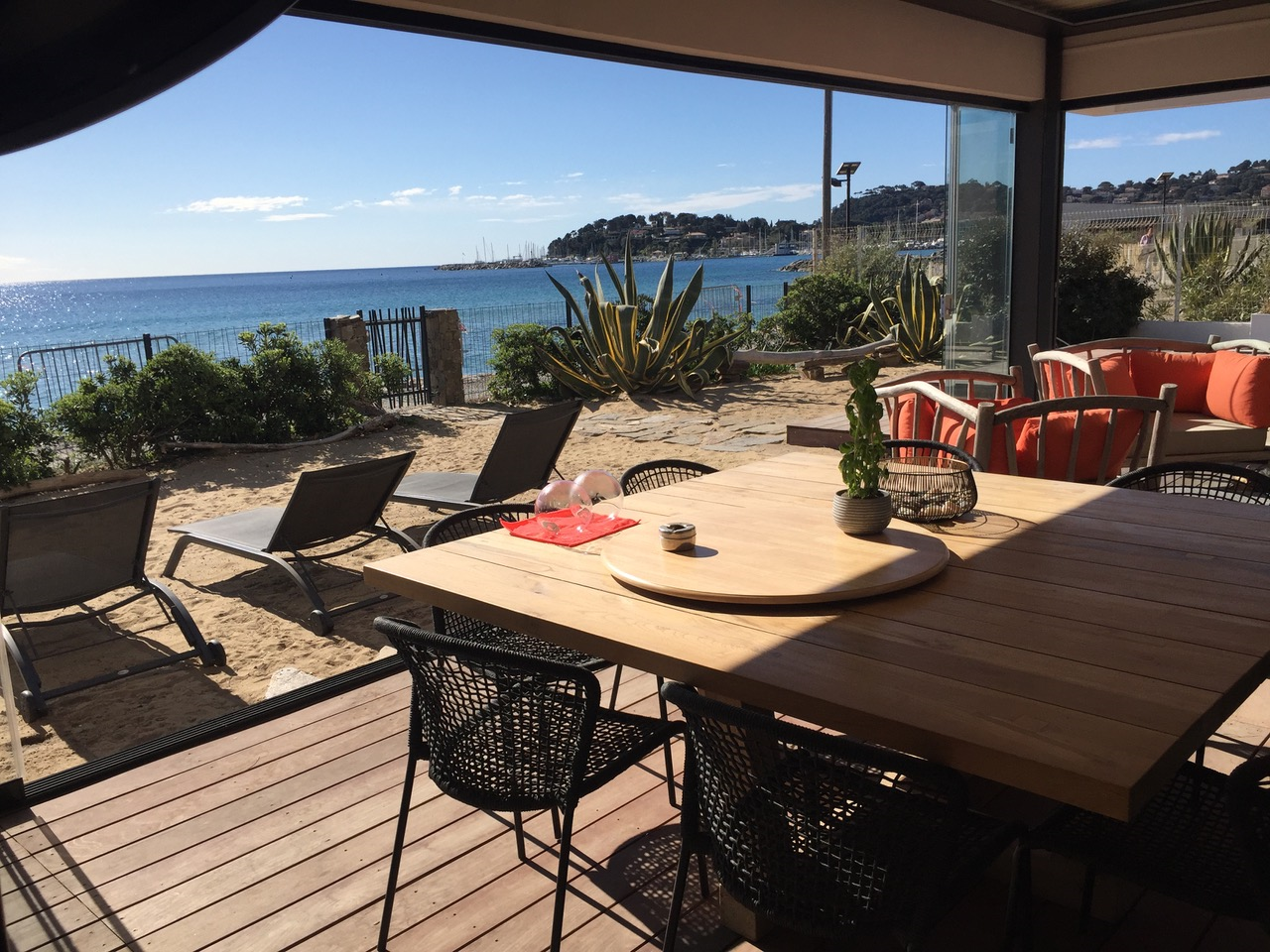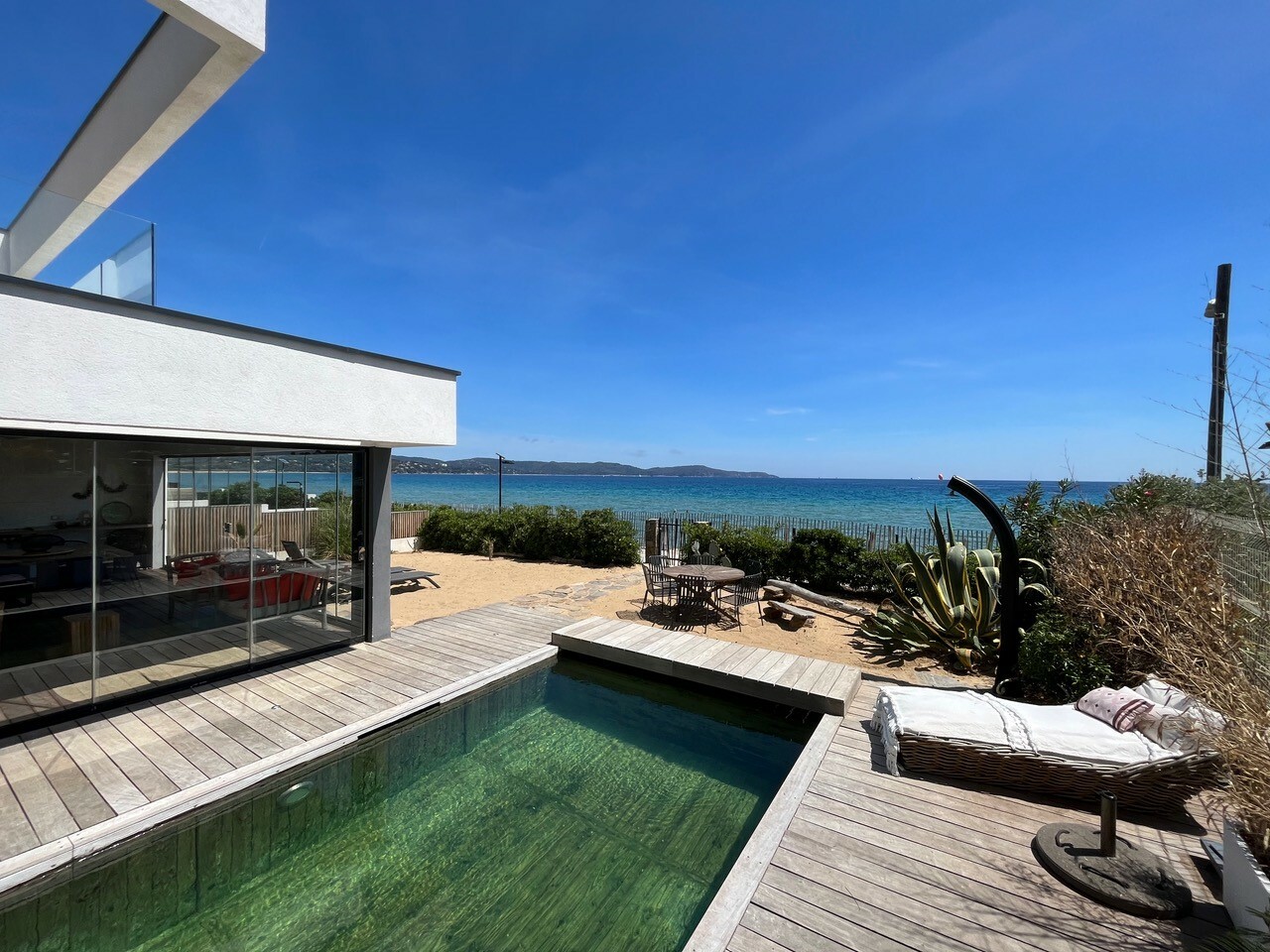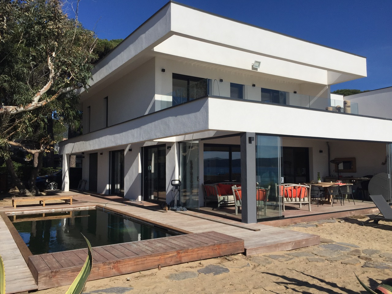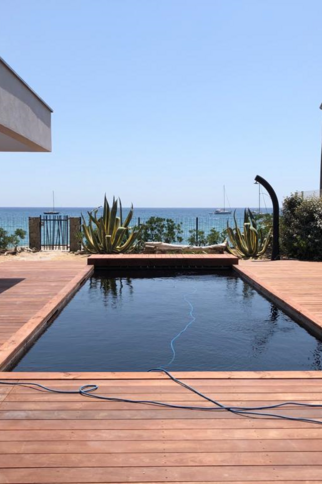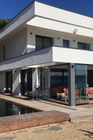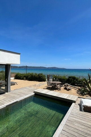 Villa of 2020 with bio pool secured by curtain and heated on the beach, located 2 Allée des Mendoles in Cavalaire sur Mer, of 170 m², composed of 6 bedrooms and 5 bathrooms.Air conditioning, misting system, outdoor kitchen, glass wall and bio climatic pergola.