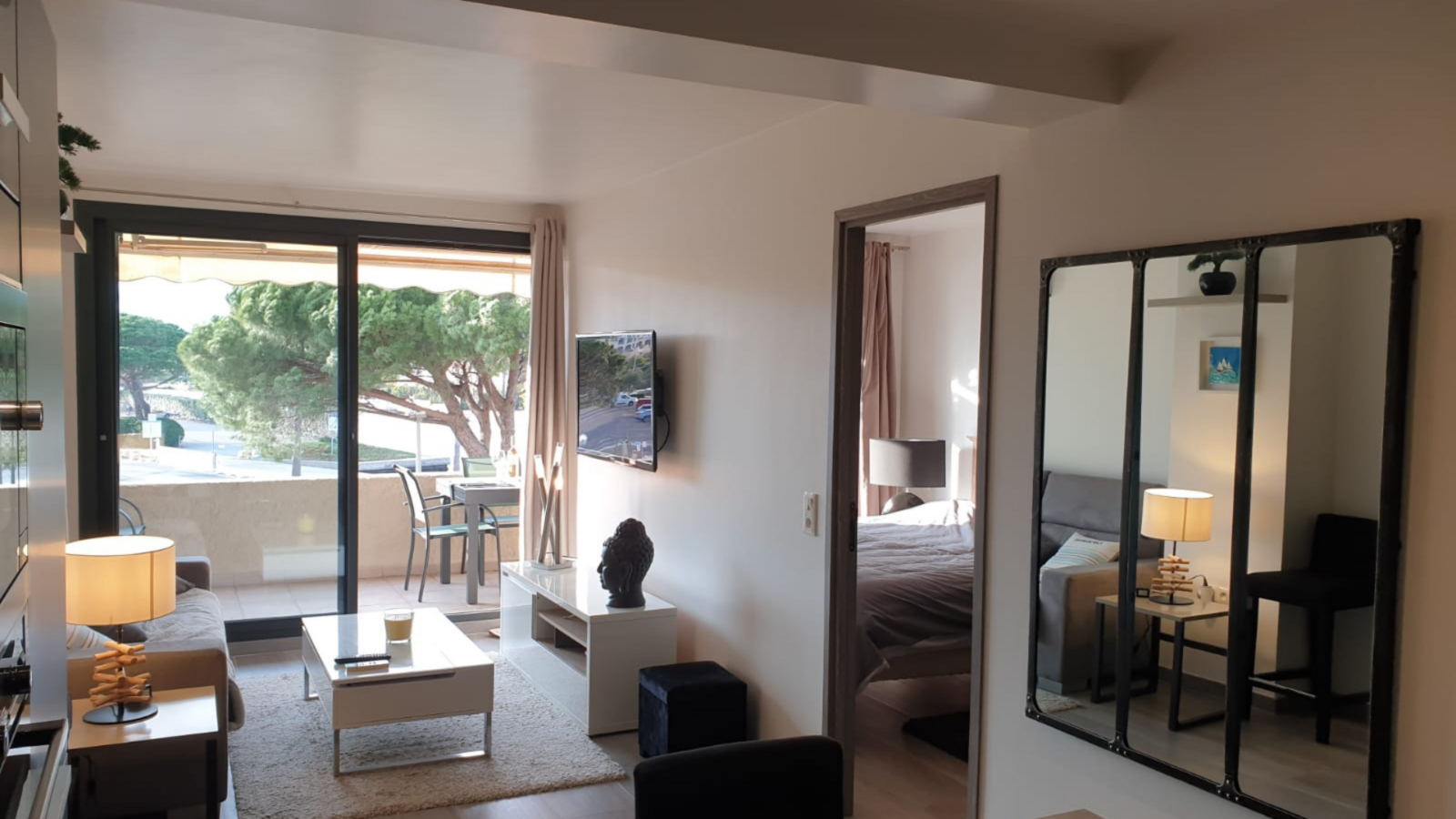 The apartment is ideally located 4 kms from St Tropez and 7 kms from Ste Maxime in a quiet, secure residence. It is fully renovated, with recent reversible air conditioning, a fully equipped kitchen (dishwasher, washing machine and dryer), living room with comfortable sofa bed, 2 televisions, large west-facing terrace with sea view + marina, large bedroom with Big Bed 180 x 200 with dressing room, shower room with Italian shower, separate toilet, wifi box by fiber.Secure parking spaces with video surveillance and double automatic gates.