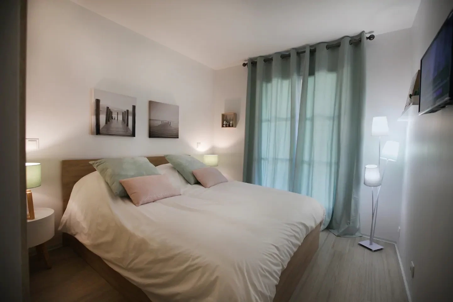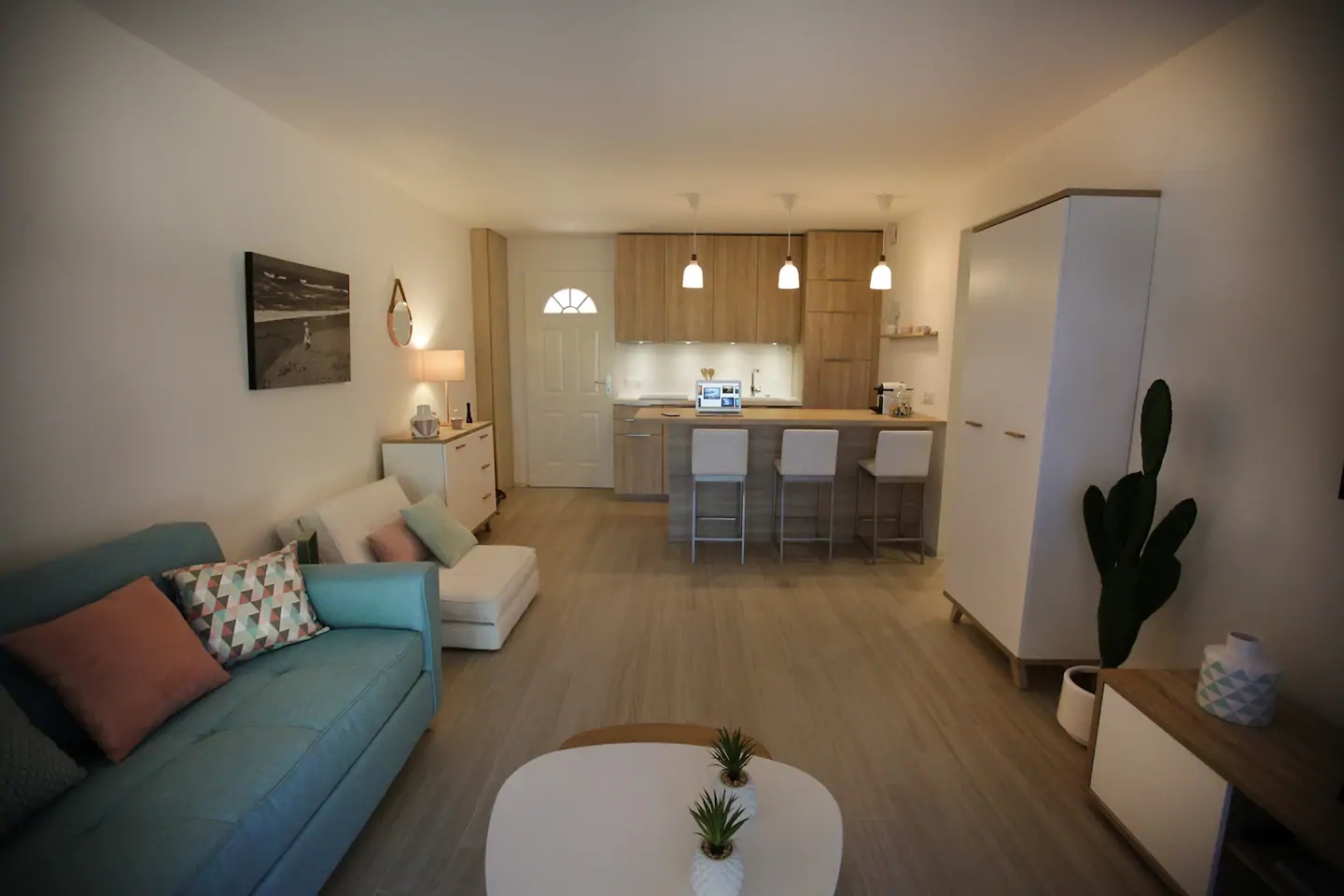 The apartment has just been renovated with a sober decoration in pastel colors.It sits in a corner of the building with just one floor above it.