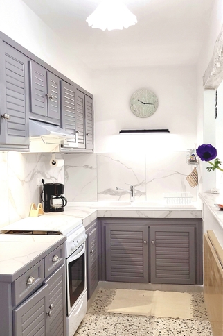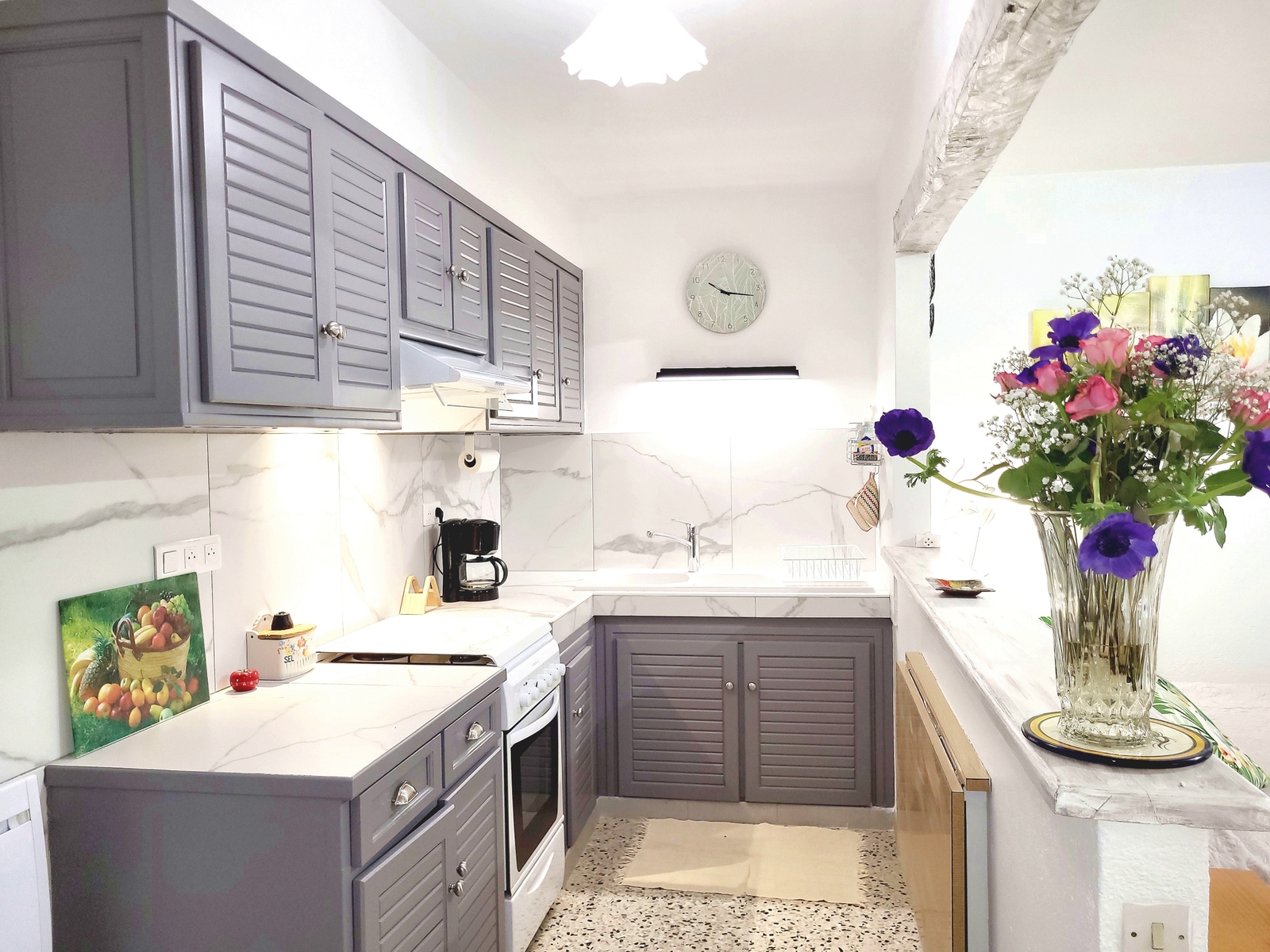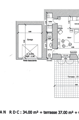 - an open-plan kitchen (separated from the living room by a bar) measuring 8m2, equipped with: crockery and cutlery, gas oven and hob, microwave, electric coffee machine and kettle, pressure cooker, blender, ironing board and iron, hoover, heating, etc....