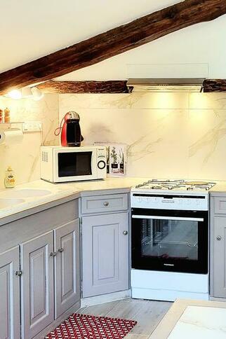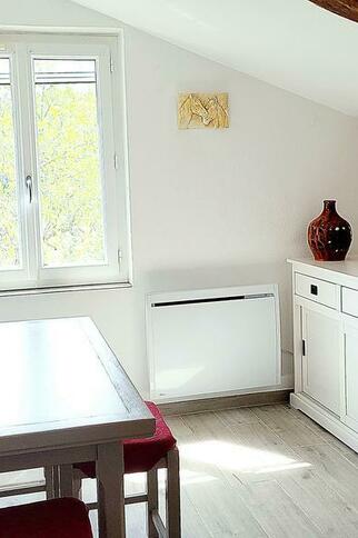 - An alcove under the sloping ceiling in the kitchen, where there is a third bed,