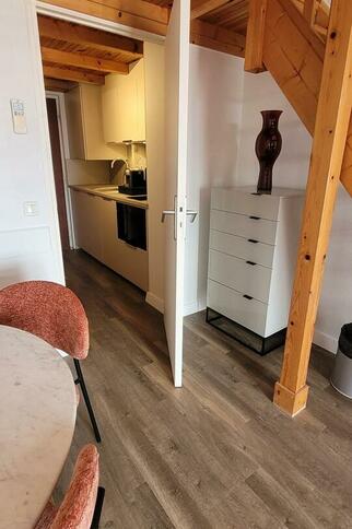 The entrance hall has a fully equipped kitchen and access to the bathroom (private shower and toilet). The living room has a sofa bed (sleeps 2, 160 x 200 cm), a table and chairs, a television and WiFi. The bedroom is on a mezzanine level with a 160 x 200 cm bed.
