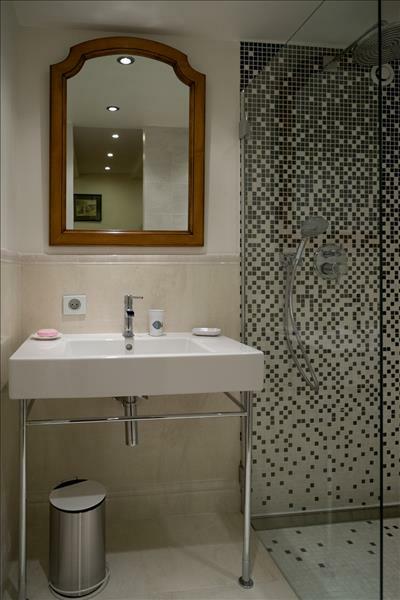 On three nivels, it accomodates comfortably four persons in two rooms with shower-rooms.