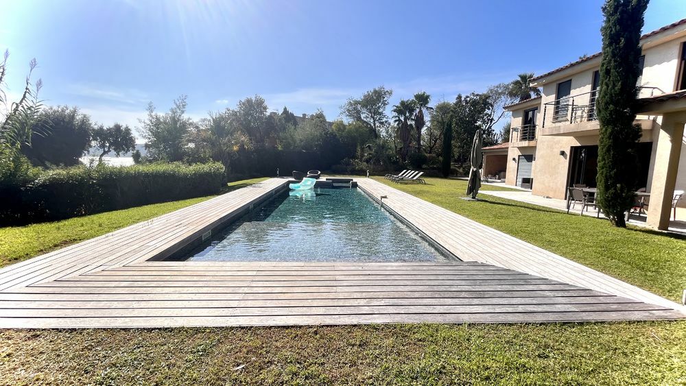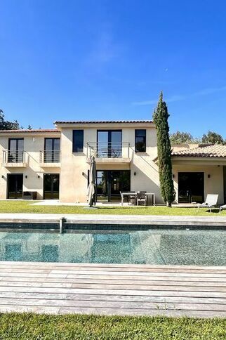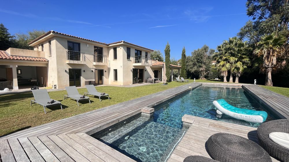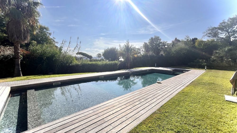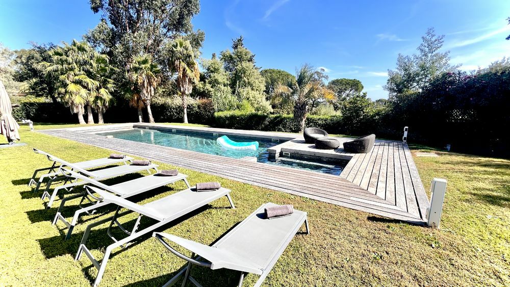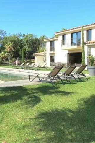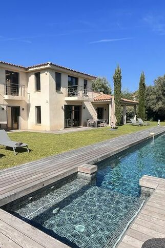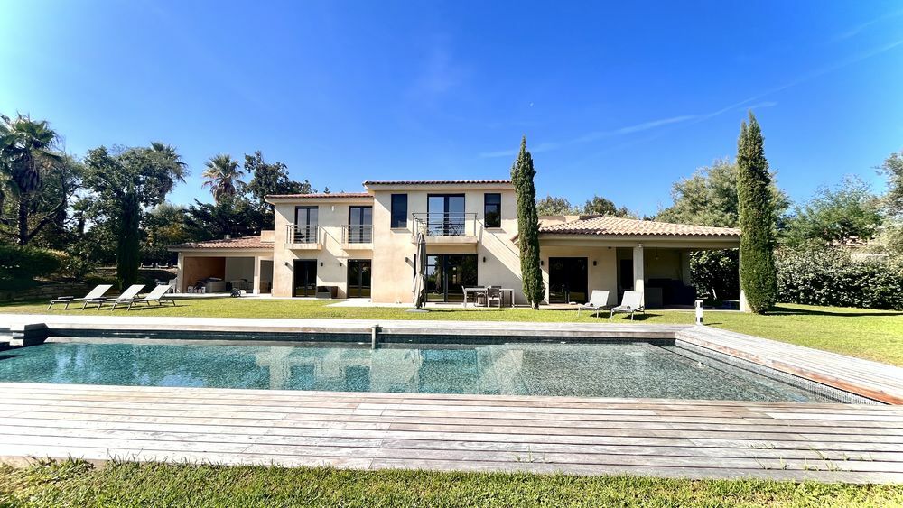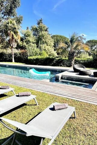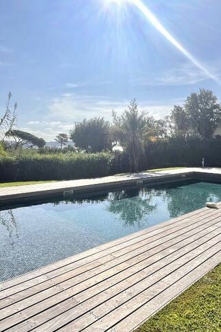 Beautiful, spacious house with a chic, contemporary style, located in the famous Domaine de Beauvallon between Grimaud and Sainte-Maxime. It has a large landscaped garden with lush lawns, an idyllic sea view and a large swimming pool. The ideal combination for relaxing days spent lazing in the summer sun.With 7 bedrooms, it can accommodate a large family or a group of friends.