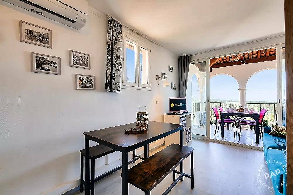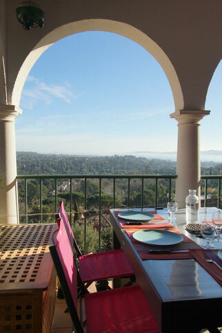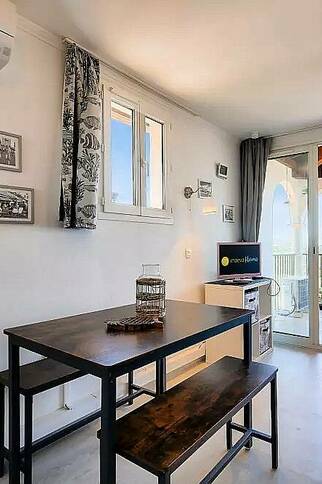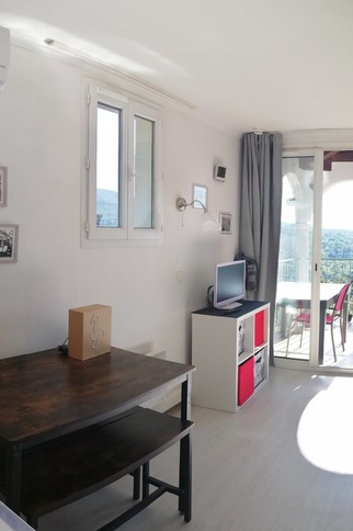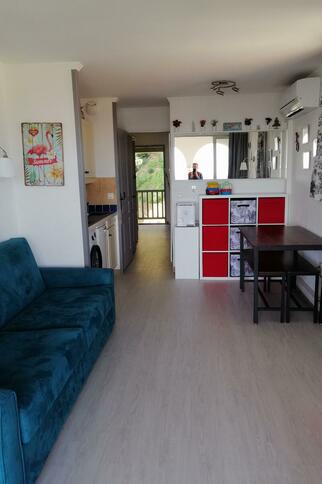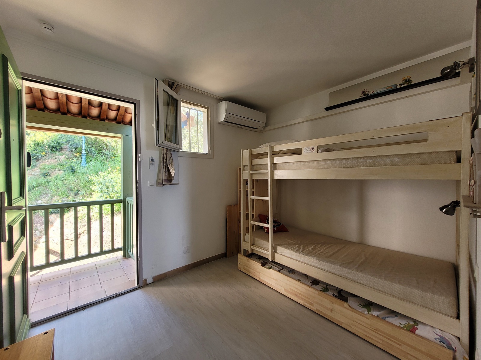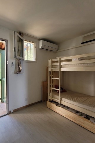 Located on the heights of the landscaped residence. On the 1st and top floor of the Violettes building. The room is equipped with bunk beds. There is a separate toilet. A bathroom. Fully-equipped kitchen area (dishwasher and washing machine, ceramic hob, toaster, coffee maker, fridge) on the terrace. Convertible sofa in 160. TV and wifi fibre. Covered terrace with panoramic views over the Mediterranean and Saint-Tropez.