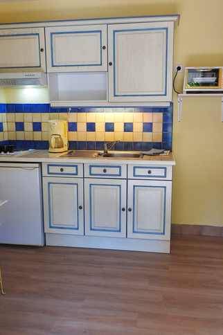 - Living room with sofa, TV and kitchen area, equipped with a refrigerator, ceramic hob, combined microwave oven, mini dishwasher, coffee maker, kettle, toaster, etc.