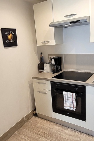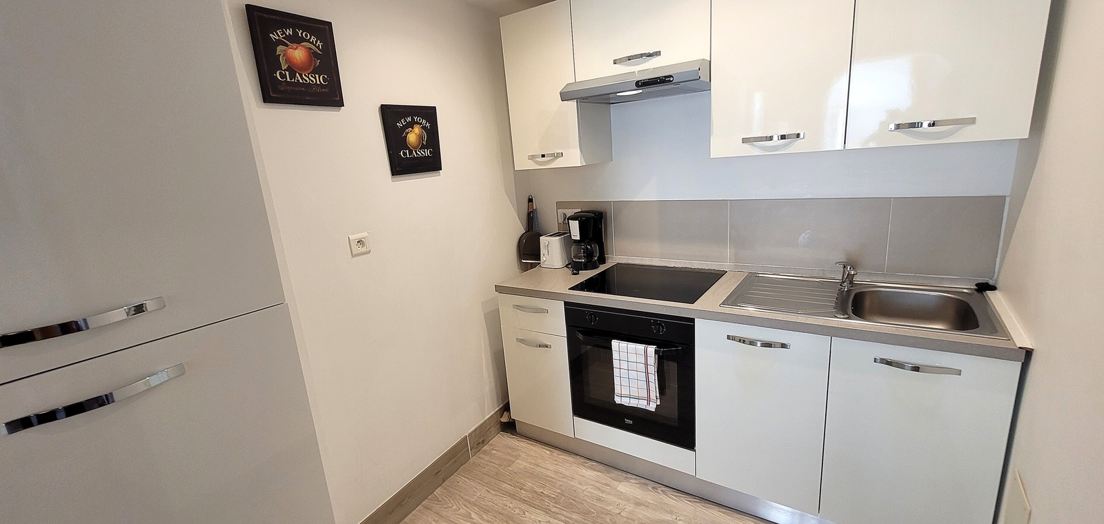 The apartment comprises a spacious living area with sofa bed, and a dining area opening onto the fully-equipped kitchen.