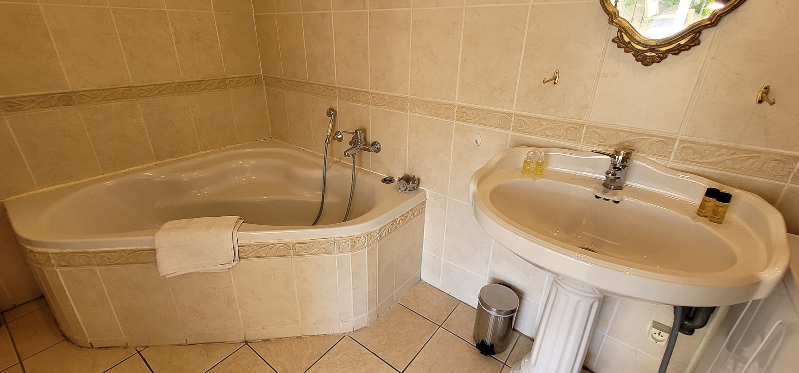 The bedroom has a large sliding glass door opening onto the balcony, a double bed and en-suite bathroom with corner bath.