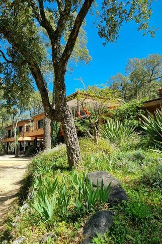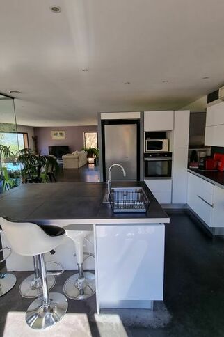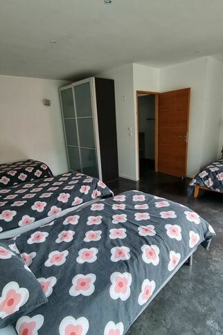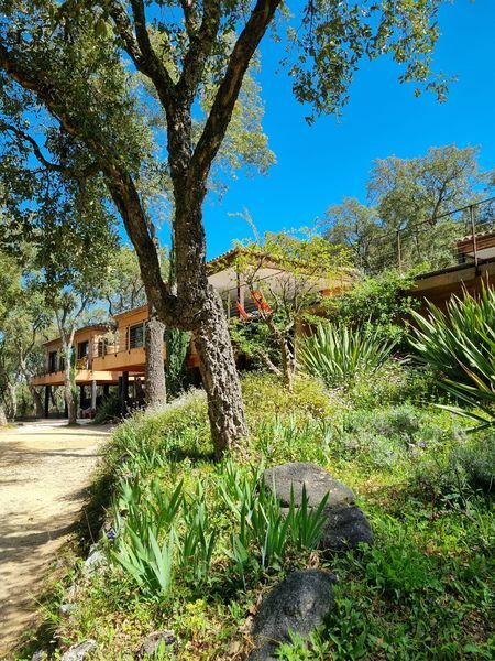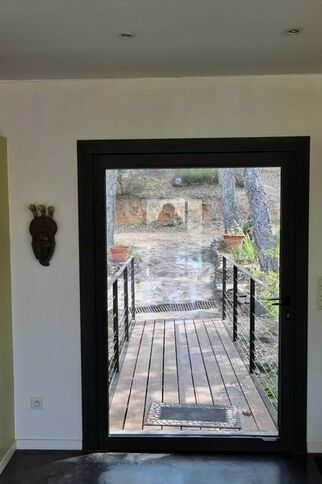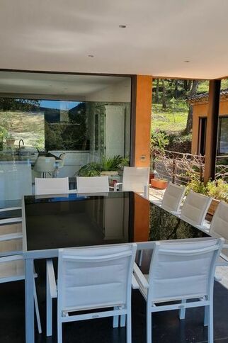 This house is built on stilts and is composed of three modules. We enter through the central module, 92m² of living space with a large main living room, a small adjoining living room and a beautiful open, modern and equipped kitchen. All the windows give the impression of being in the forest.A glass-walled and glass-roofed walkway leads to the first module of the cambers, which contains a double bedroom with en-suite bathroom and toilet and two further double bedrooms, each with its own shower room. These three bedrooms all have access to a large balcony through which they can communicate, and a walkway leading directly outside.