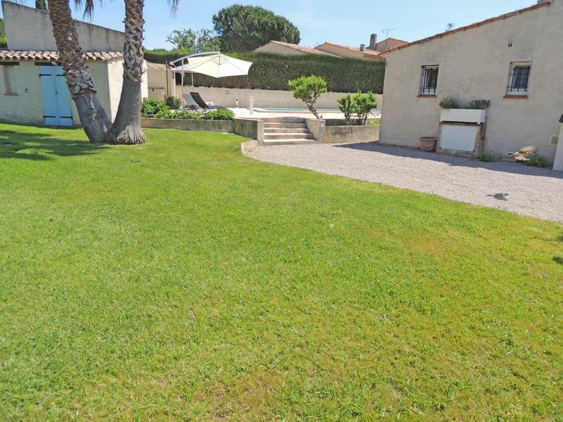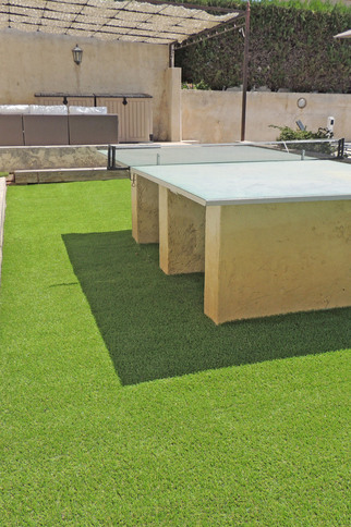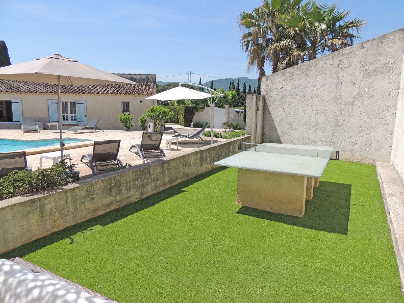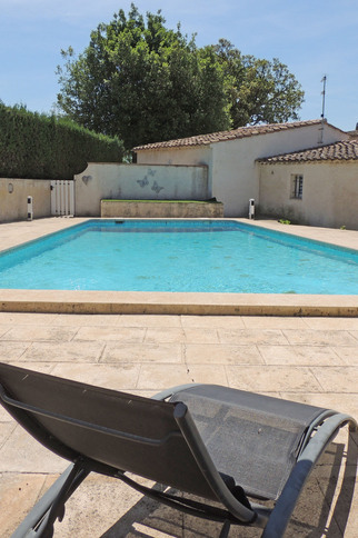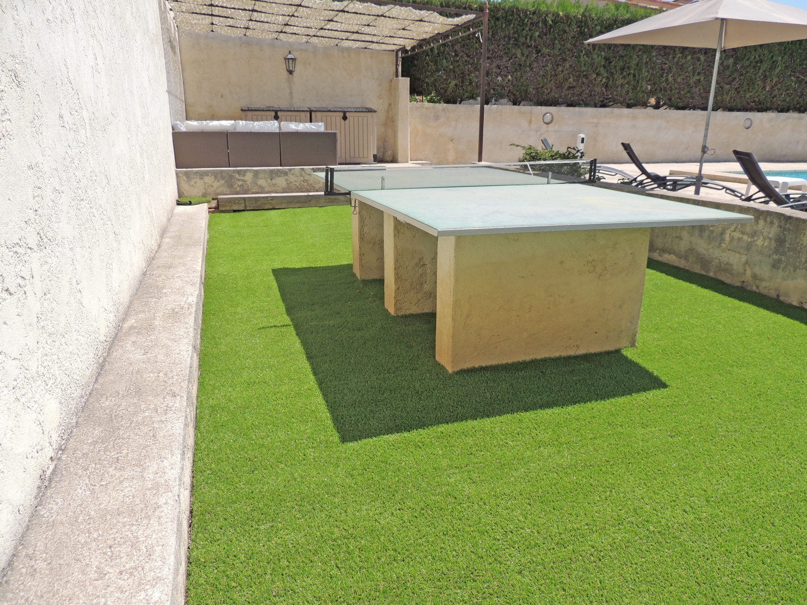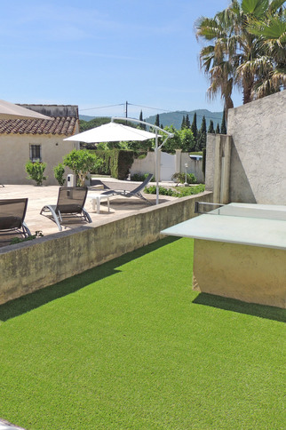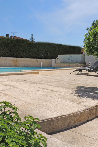 The swimming pool is at the back of the villa. It has a pergola, a table tennis table and a paved terrace around it where you can find deckchairs and outdoor furniture. The pool is equipped with a perimeter alarm system, which is very safe for the youngest.