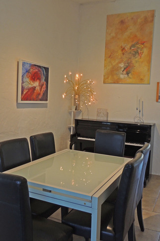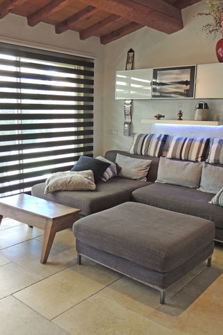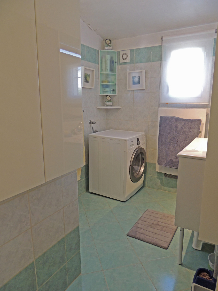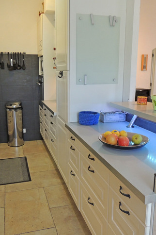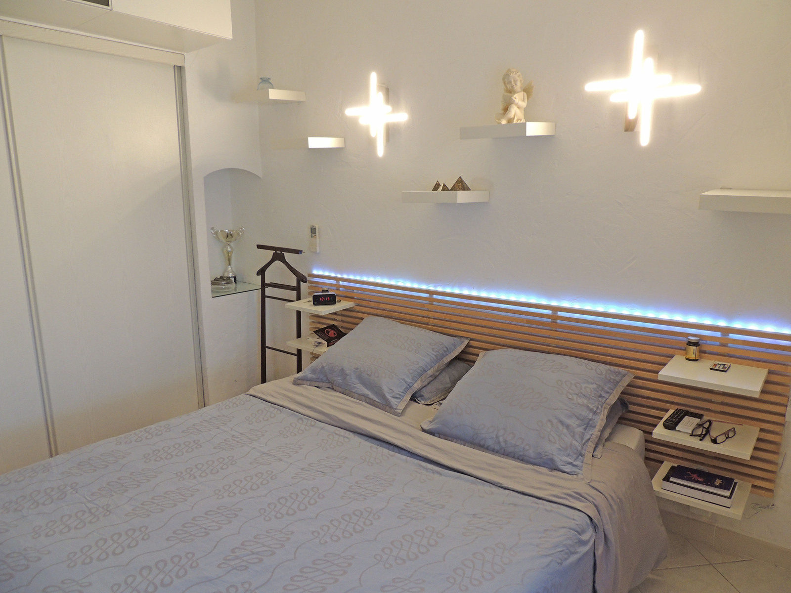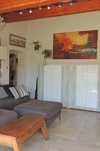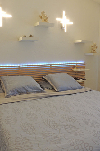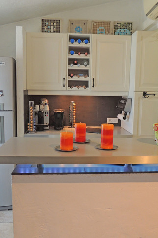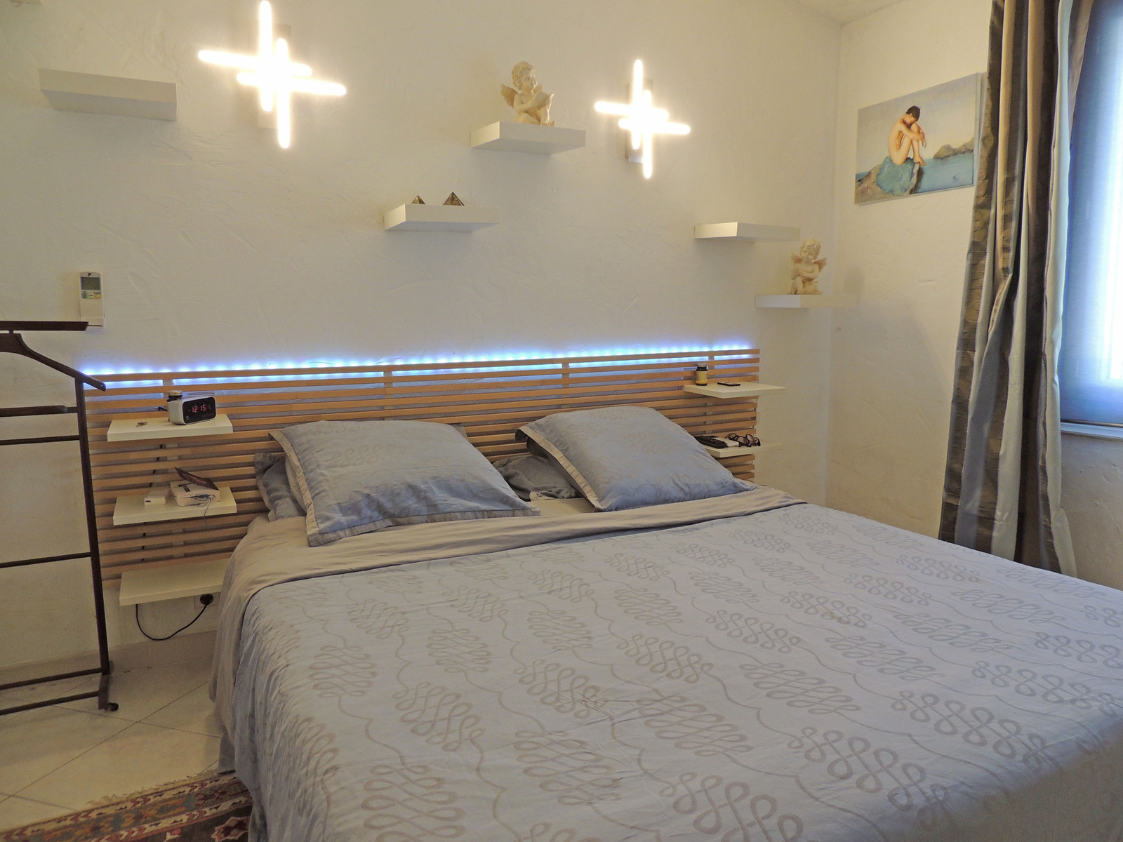 At the entrance, you will find an air-conditioned living room with a large flat screen, DVD and Home Cinema, including a large corner sofa. The adjoining dining room, also air-conditioned, is furnished with a large table and an LED television. The open-plan kitchen is an extension of the living room and is equipped with high quality appliances: dishwasher, microwave, hob (2 induction, 2 gas) and traditional oven.