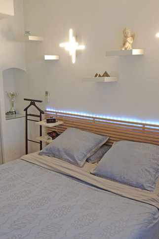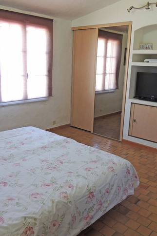 The air-conditioned master bedroom has a large 160 cm bed, a large fitted wardrobe and a flat screen television.