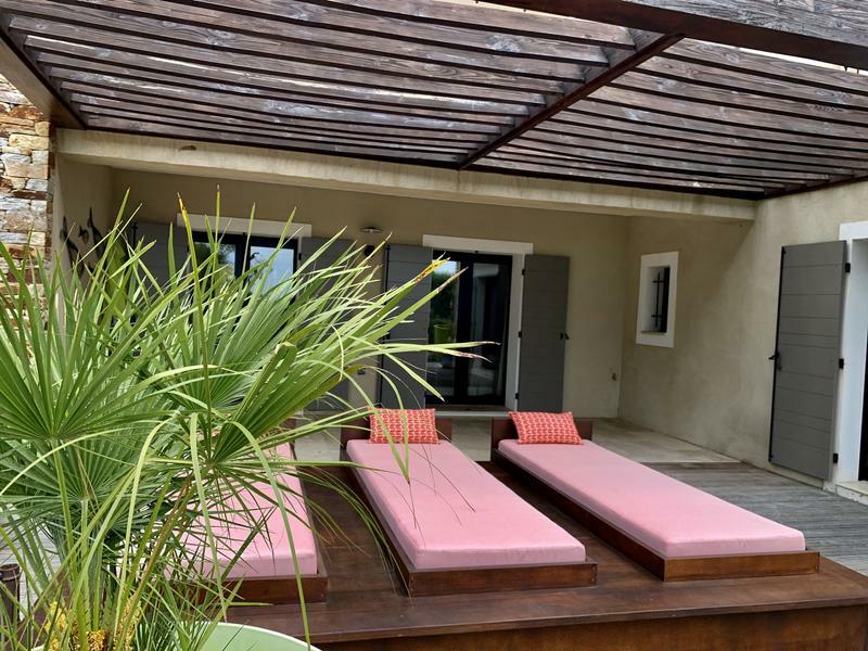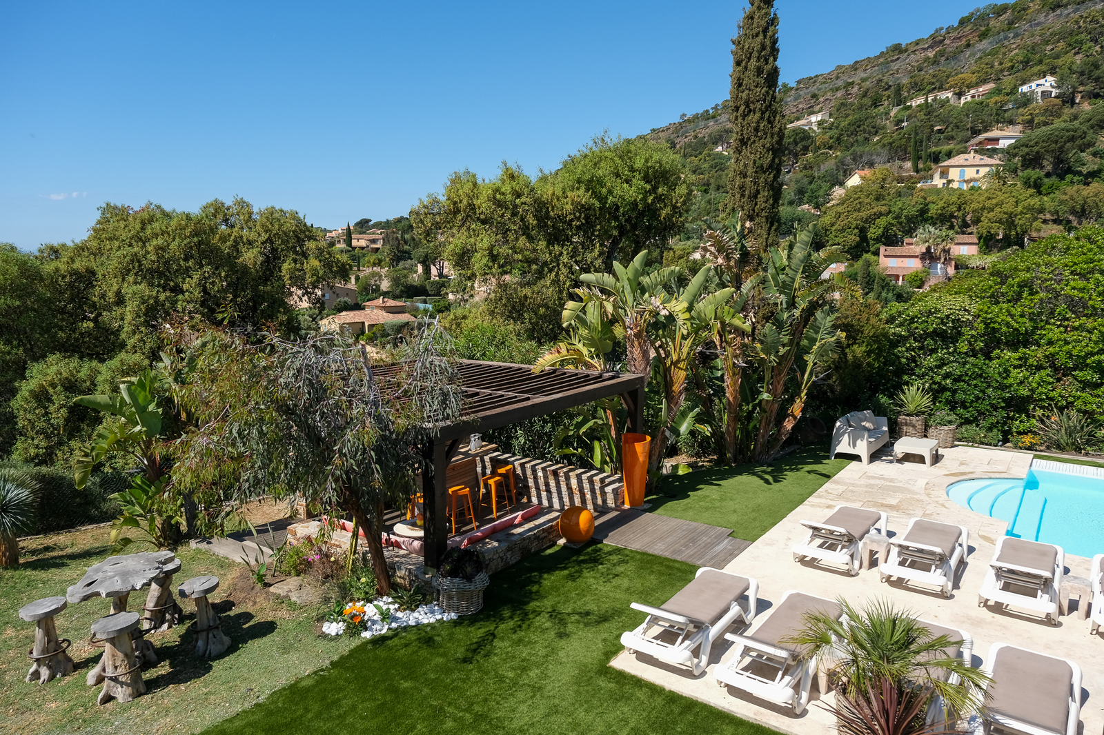 Quiet villa completely renovated inside and out, 1000 m2 Mediterranean landscaped garden, pool house with bar, sofas, fridge, sink, plancha, large infinity pool equipped with 10 relaxers and 3 other terraces and patios equipped with armchairs and sofas, pétanque court, siesta area.Breathtaking views of the sea, the Iles d'Or (Levant, Port Cros) and the hills of the Maures massif. Ideally located, not overlooked, 300m from a small protected beach with bar, restaurant and mattress rental.