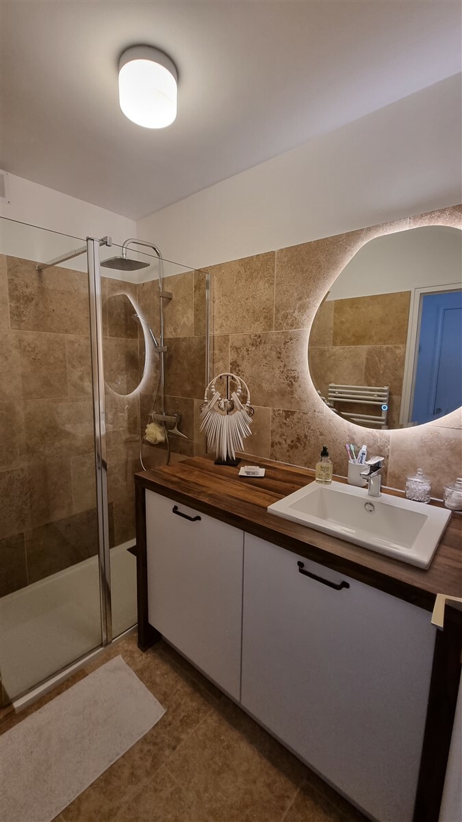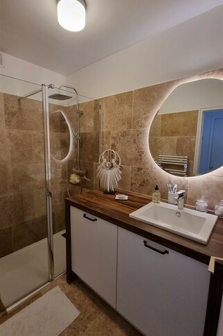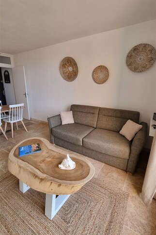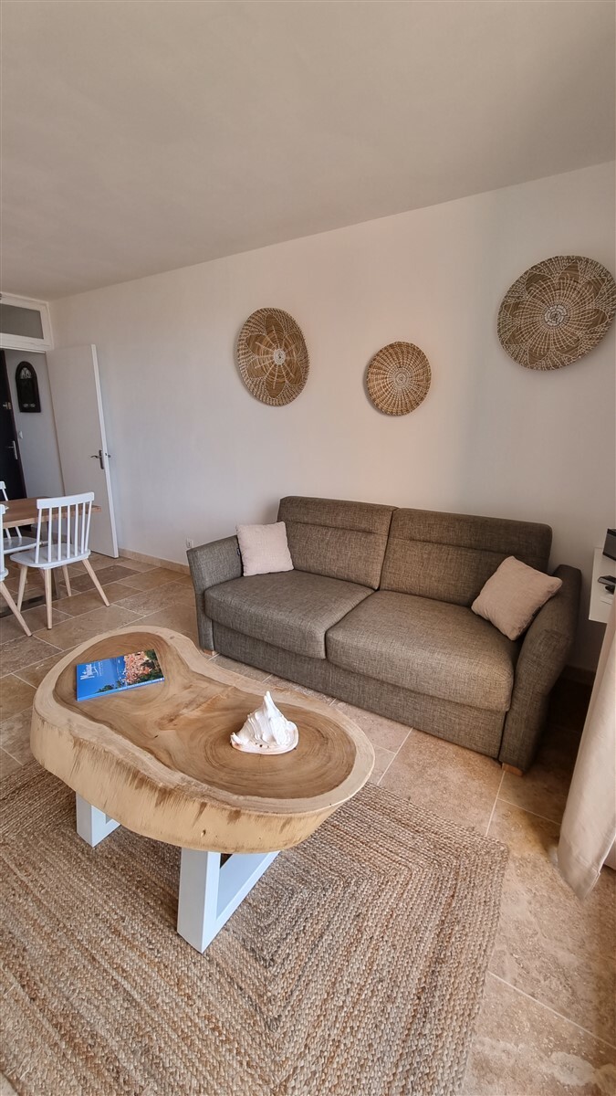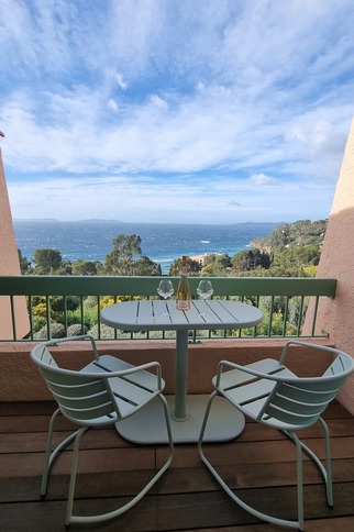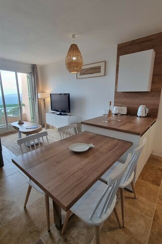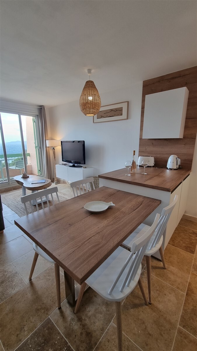 Just a few steps from the Rayol beaches, bright, air-conditioned 40m2 T2 apartment. Completely renovated, with breathtaking sea views and nestled in a park, it comprises a living room with fully-equipped open kitchen, separate toilet, bathroom with walk-in shower and spacious bedroom, ideal for a couple.