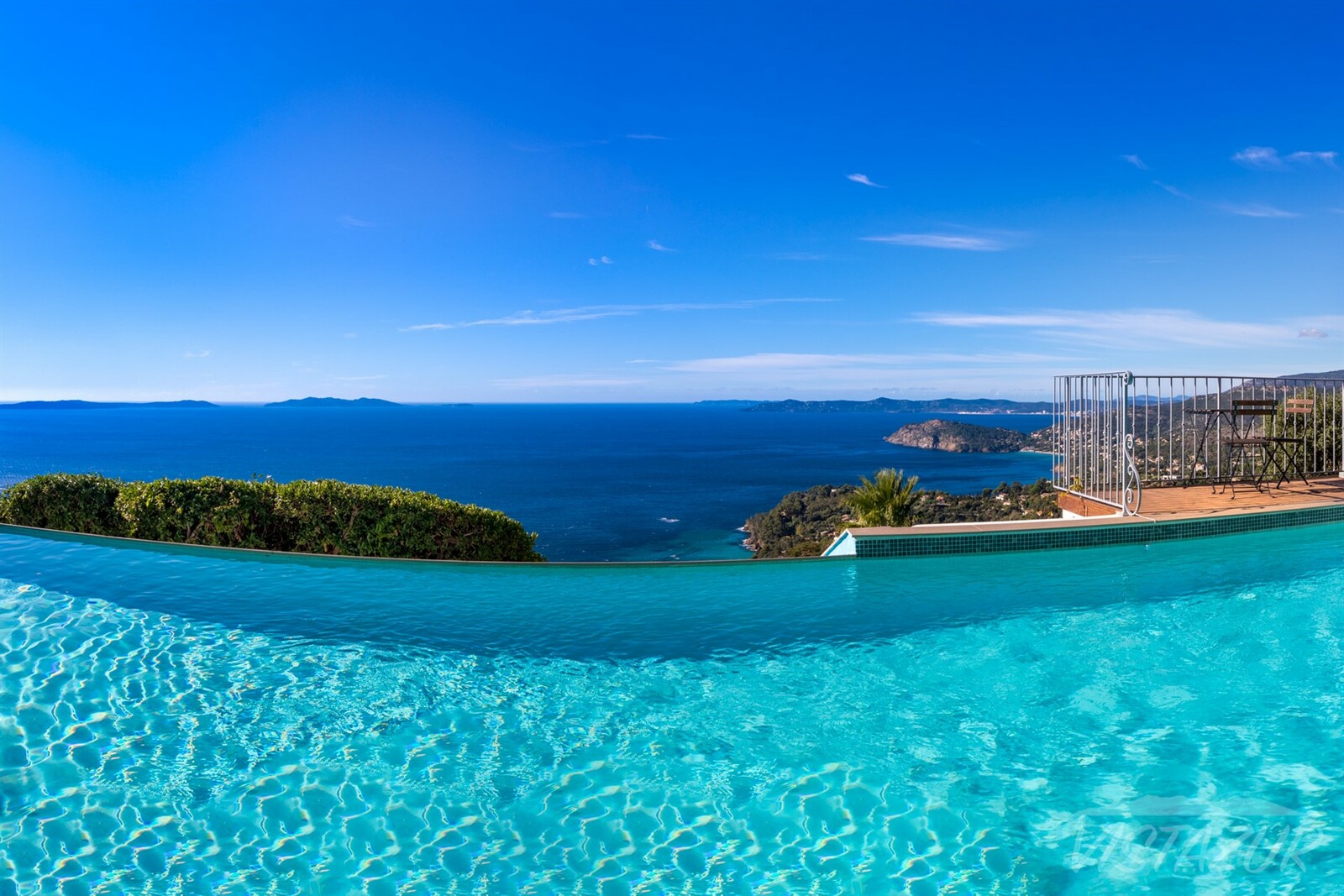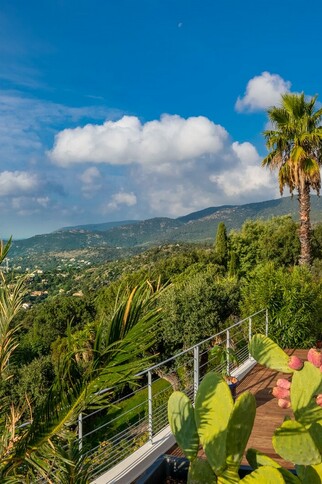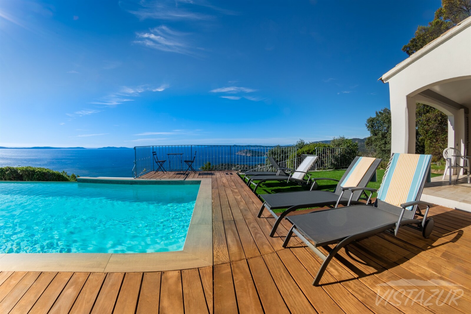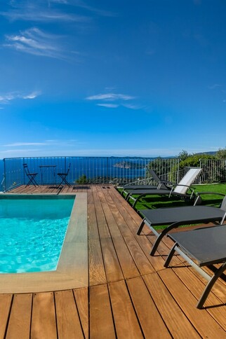 Welcome to our home!You are our unique guests, on the heights of the village 800 m from the center, in a luxurious studio for 2 (38 m ²) or apartment for 2 to 4 people (60 m ²) on the first floor of our villa in a magnificent park. An 86 m² terrace and loggia with panoramic views of the Mediterranean and the Golden Islands, plus a superb swimming pool, are dedicated to you!