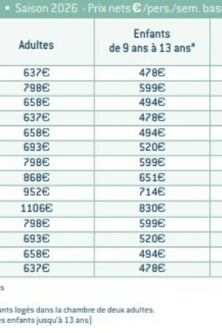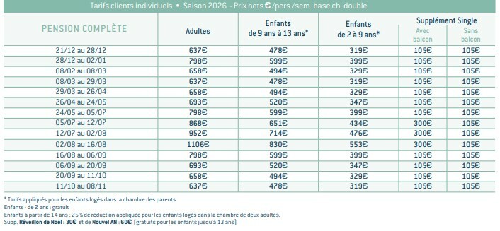 Double room: from 546 to 588 € (Price/pers/week in full board).