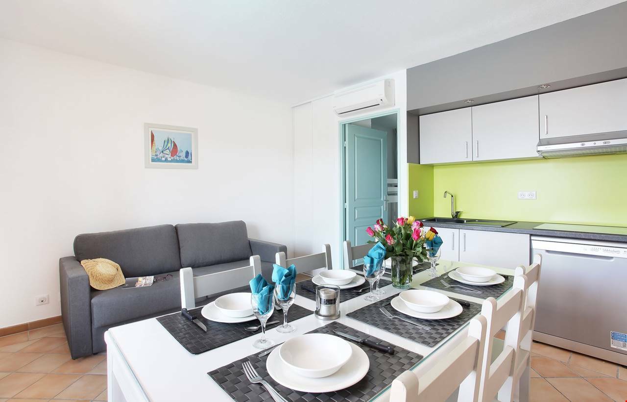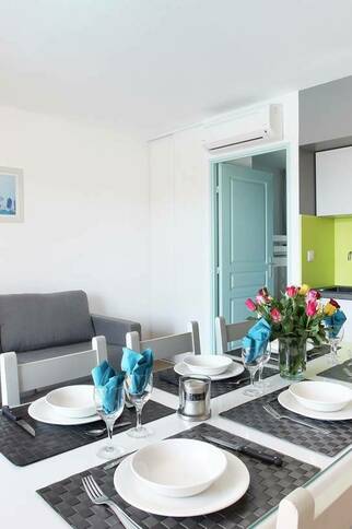 Composed of small buildings grouped around two swimming pools, the 3-star La Palmeraie residence is located 3km from Port-Grimaud. Open onto a terrace or a balcony, the apartments are air conditioned and equipped with kitchenette (ceramic hob, microwave, dishwasher), bathroom, separate WC for the most part, television and free wifi.At your disposal: heated outdoor swimming pool (except July / August open from mid-April to the end of October, pétanque court, paid laundry and free outdoor parking (limited places).