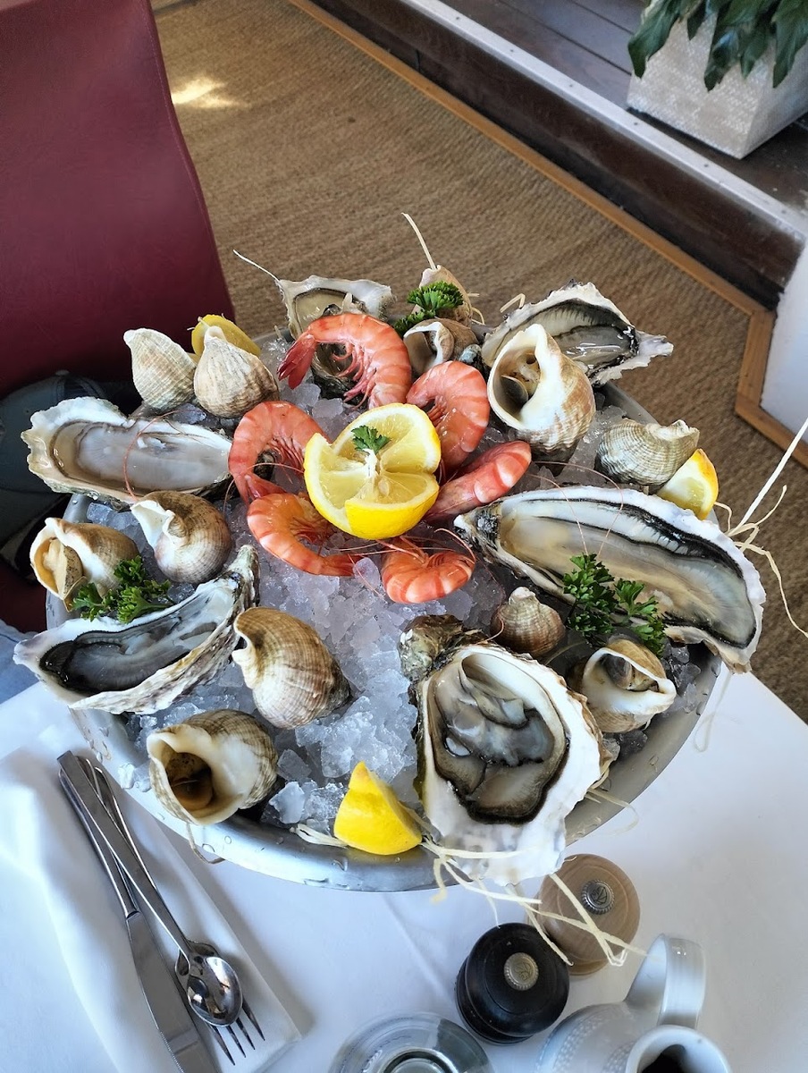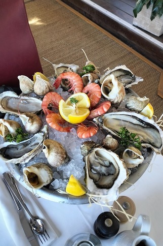 Platters of seafood and shellfish.Grilled whole fresh fish.