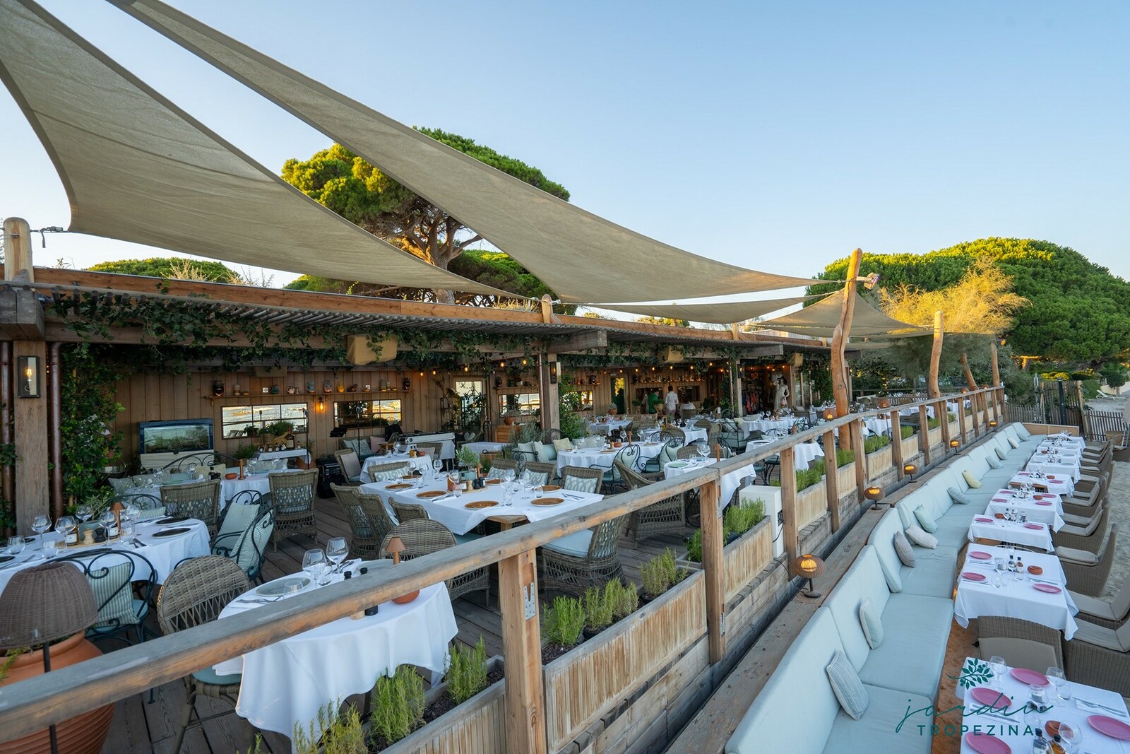Jardin Tropézina is an ideally located, easy-to-reach beach, with an enchanting wooded setting and a breathtaking view of the Bay of Pampelonne.A garden-like setting next to the deep blue sea, where you can get away from it all and relax in total tranquillity!