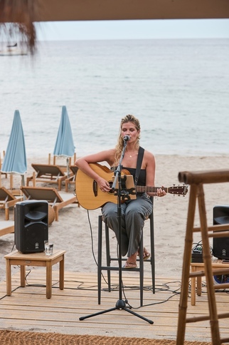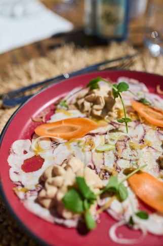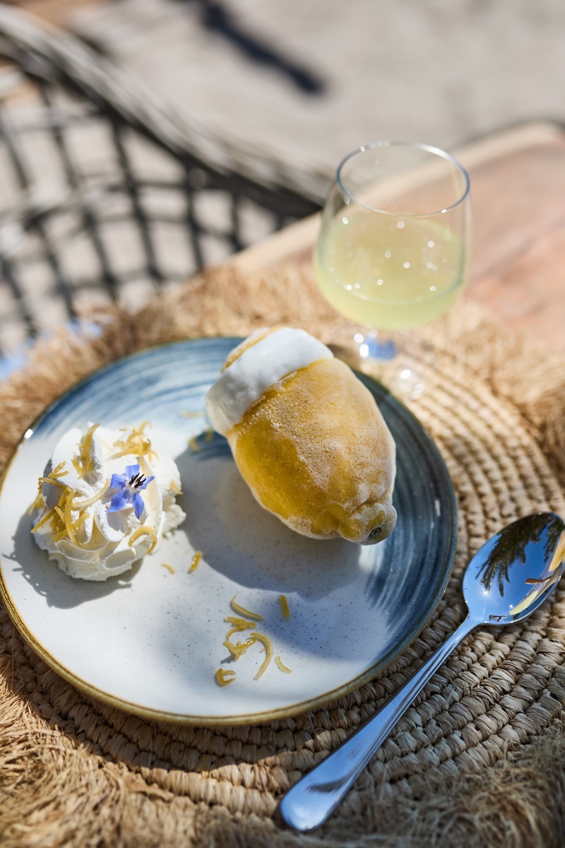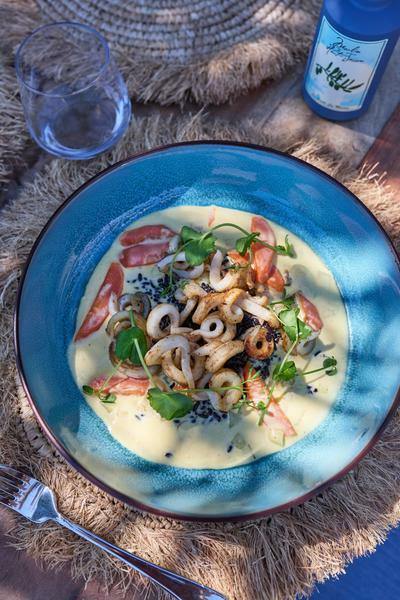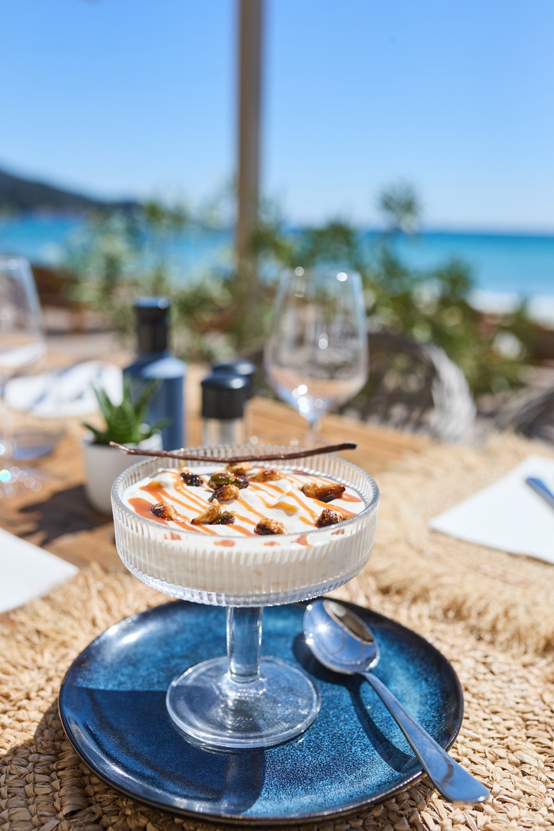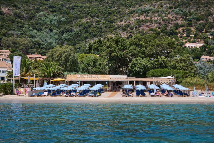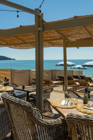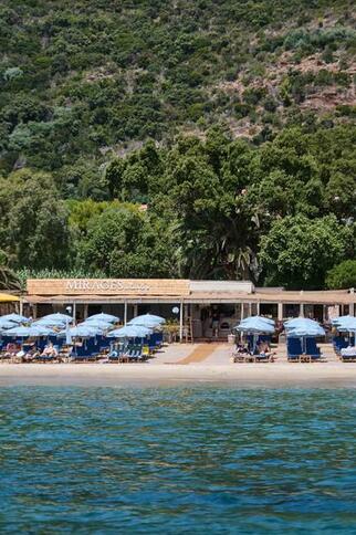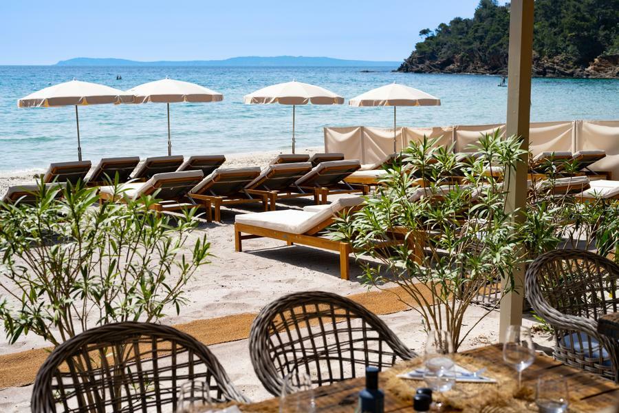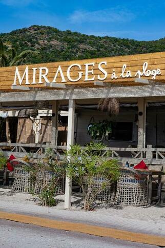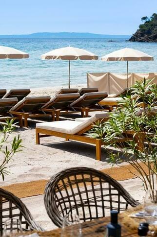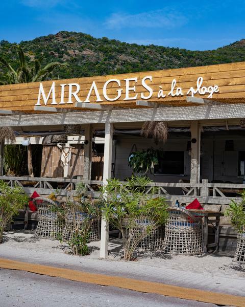 On Pramousquier beach, facing the Golden Isles, MIRAGES à la plage welcomes you for lunch or dinner. At the table and on our deckchairs, you'll discover seasonal Mediterranean cuisine, accompanied by wines from Domaine Clos Mirages.