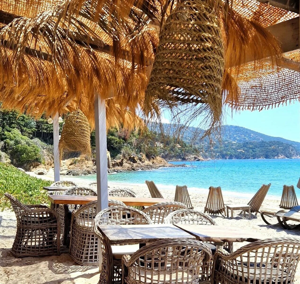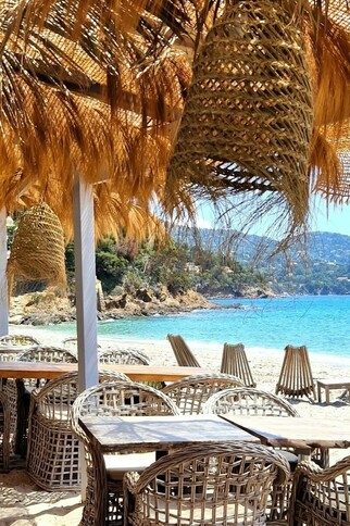 On Pramousquier beach, facing the Golden Isles, MIRAGES à la plage welcomes you for lunch or dinner. At the table and on our deckchairs, you'll discover seasonal Mediterranean cuisine, accompanied by Domaine Clos Mirages wines.