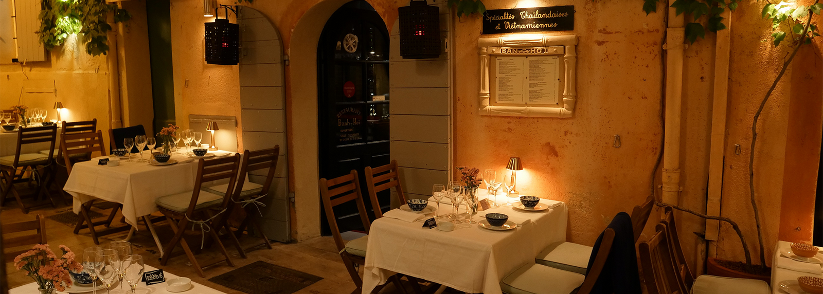 Situated in an alleyway in old Saint-Tropez at the foot of its famous bell tower, in an intimate atmosphere combining authenticity and charm, the BanH-Hoi lights up at dawn to your delight.