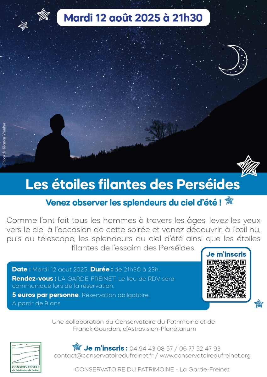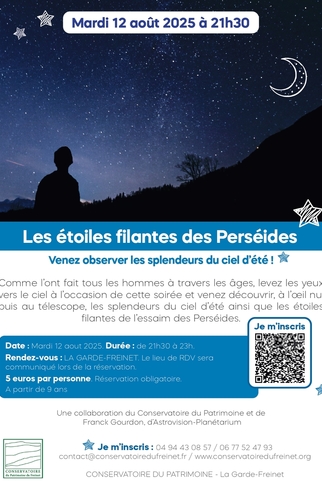 The evening will conclude with a telescopic observation of the seas and craters of our natural satellite, the Moon. And let's not forget the shooting stars of the Perseid swarm, which will mark out the evening and provide an opportunity for those who wish to do so to make many wishes... On the program :