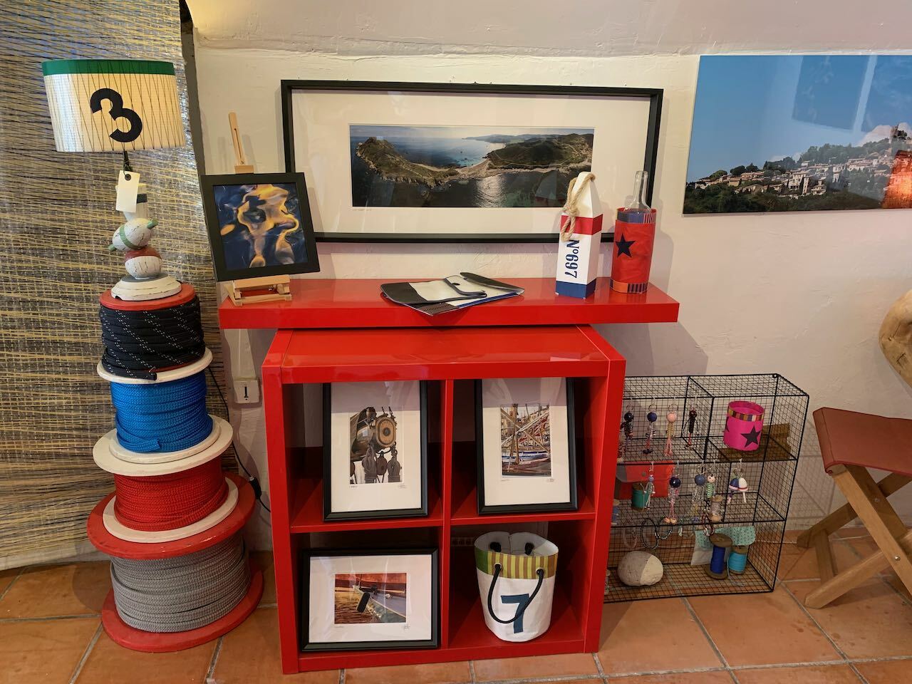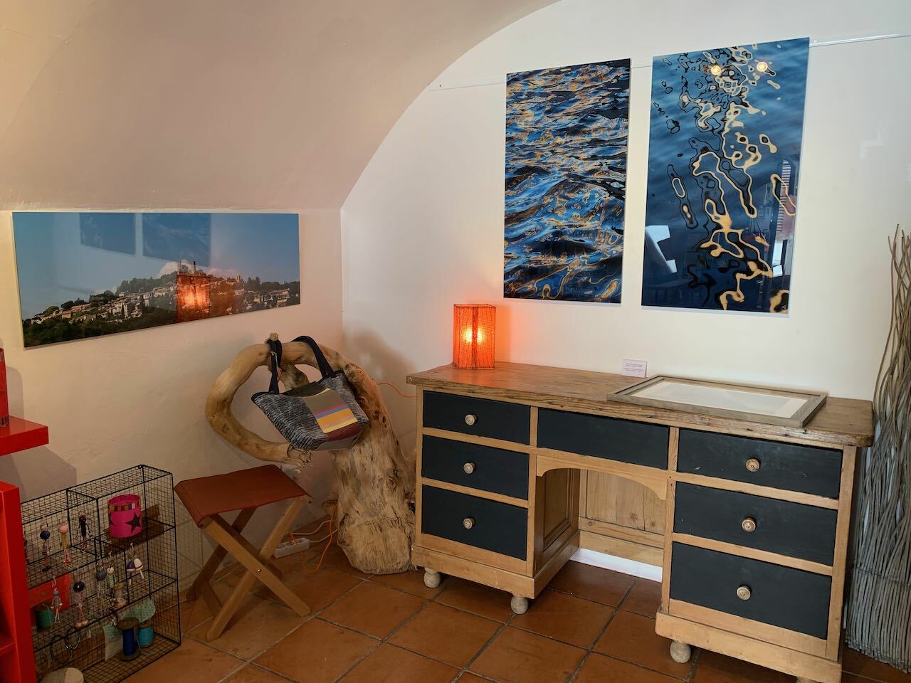 Decoration shop and photo gallery featuring Stéphane Cauchie's images printed on paper, aluminium and Plexiglas. The bags, cushions and candles are made in the village.