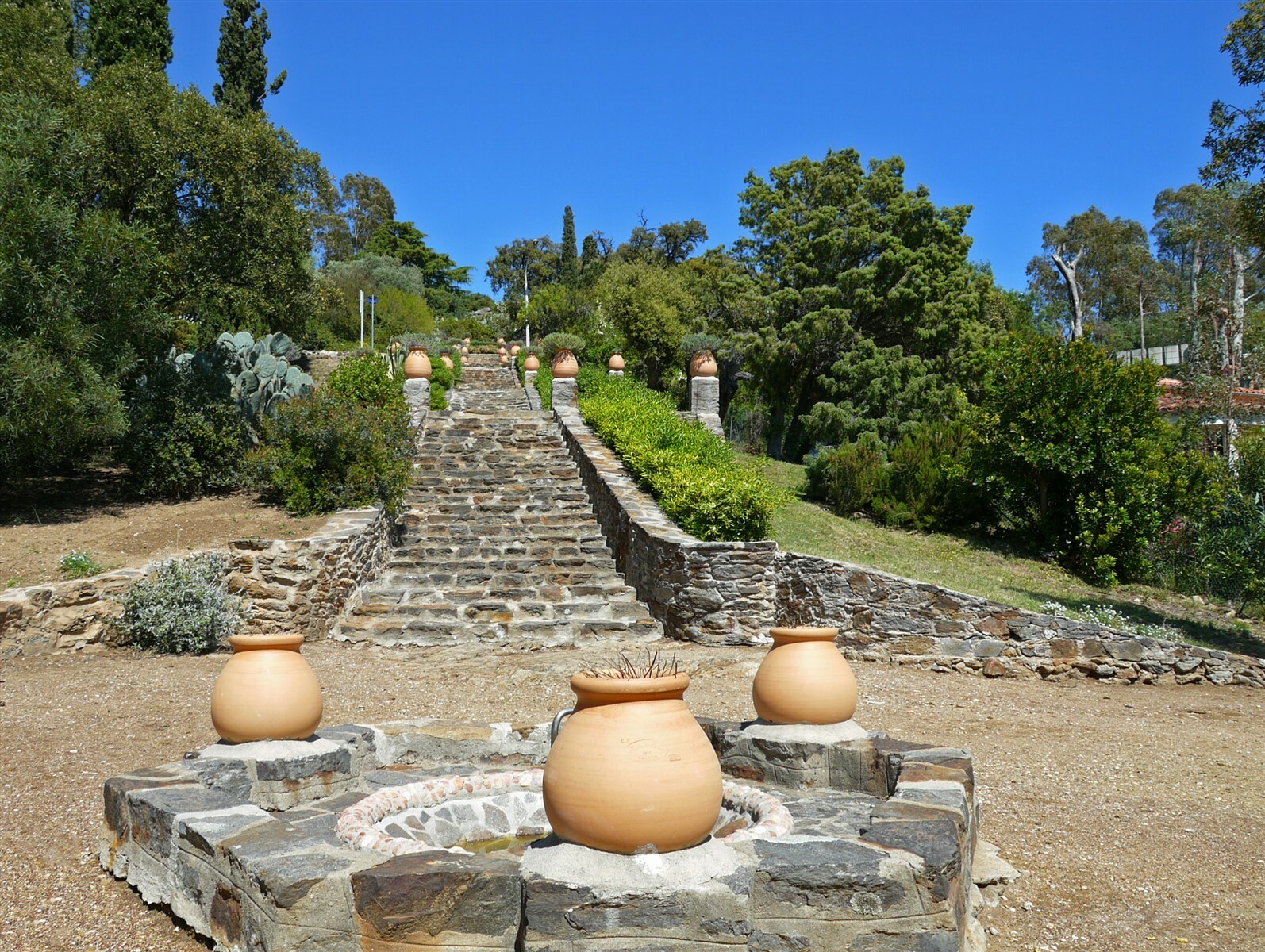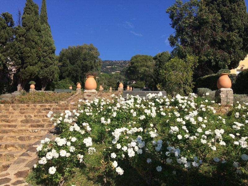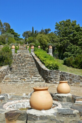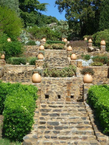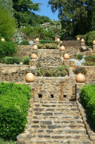 The large stone staircases are made of schist from the Massif des Maures. Low walls border it, carrying pottery jars, most of them bulging and flowered. The staircases make the best use of the accidents of the ground.