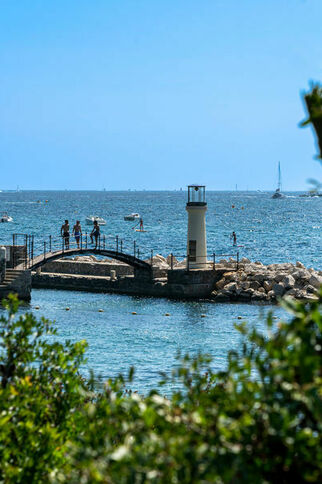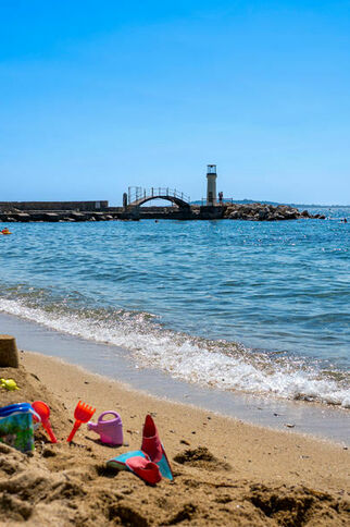 Facing the port of St Tropez, this lovely sandy beach appreciated for its decor with a little lighthouse and a picturesque bridge in basket handle.Please note: