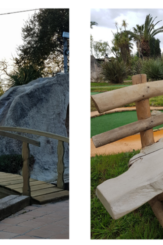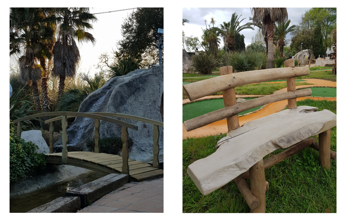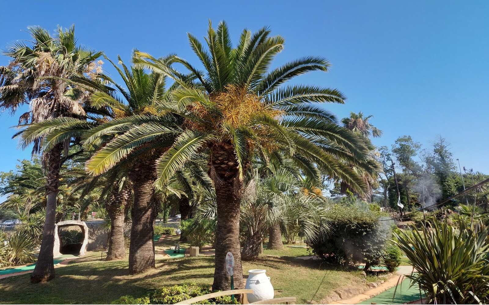 Mini-golf with 3 18-hole carpeted courses in a tropical setting with palm trees and waterfalls. Site equipped with afternoon misters and on-site restaurant (reservations on 06 41 06 47 22).