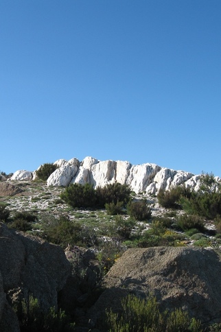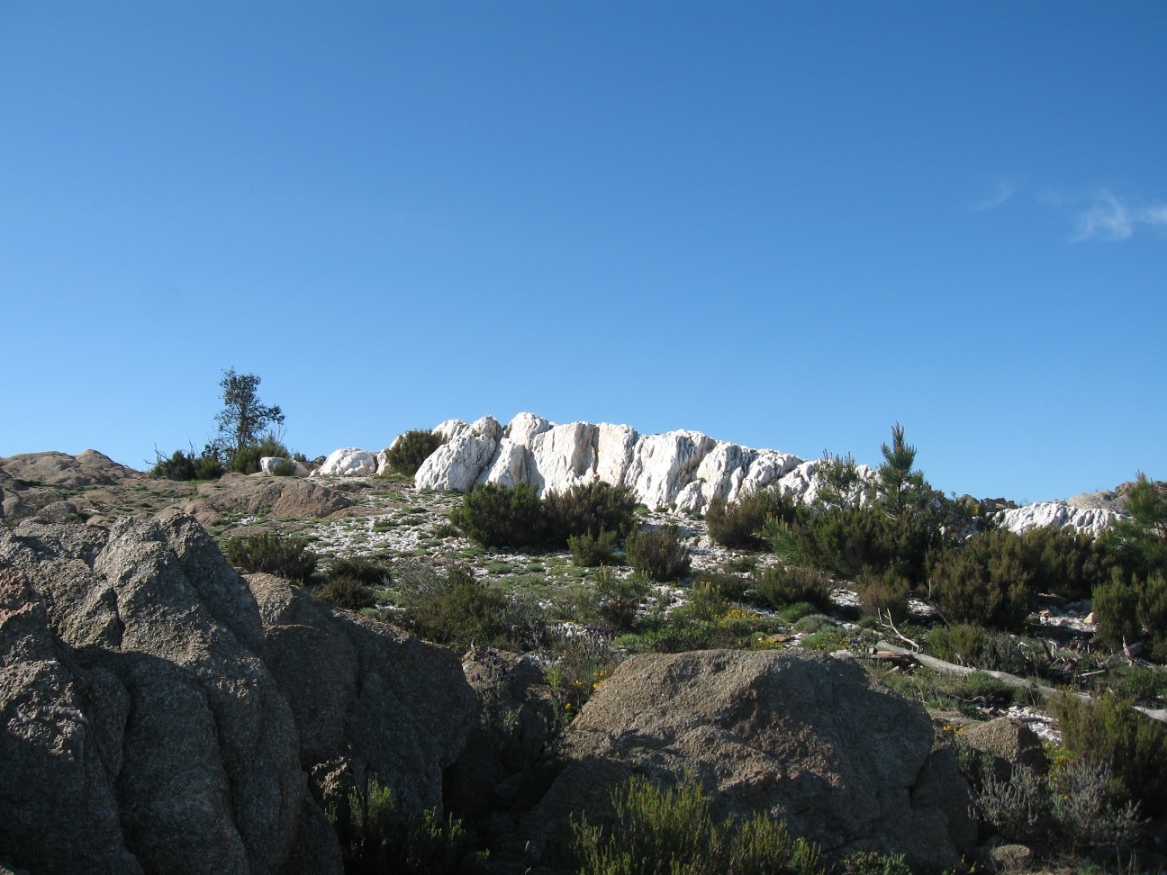 Hike 5A site of geological interest, the white rocks are composed of veins of sparkling quartz emerging from the schist.