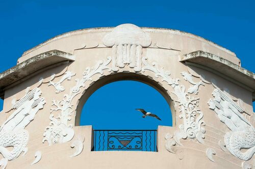 The Palace of the Mermaids is one of a series of three Art Deco buildings built in 1929 by Henri Bret in Sainte-Maxime, Saint-Raphaël and Cannes, where architecture worked on the idea of the monumental angle, crowned by a pediment.