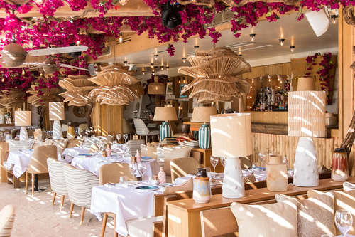 Facing the boats, feet in the sand, LA PETITE PLAGE evokes a seaside garden planted with bougainvillea in a décor of wood and rattan.