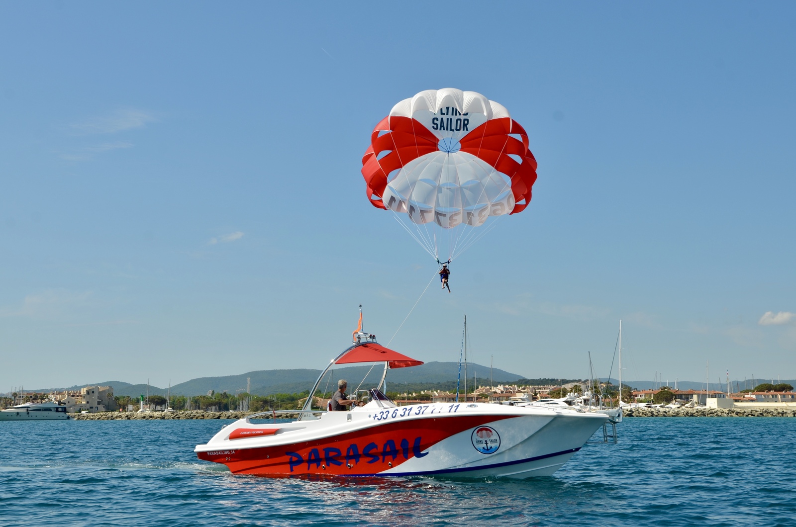 Departing from the Jet Family nautical base located 2396, route du Littoral in Grimaud or by appointment from the port of Saint-Tropez, Port Grimaud, Marines de Cogolin, The Flying Sailor invites you to discover the heterogeneous landscape of the Gulf by parasailing from Saint-Tropez: the mythical village of St Tropez, the beaches of Beauvallon, Port Grimaud, Les marines de Cogolin ...Take advantage of our teaching experience to initiate yourself in a lesson accompanied by an instructor or improve your skills in water skiing, wake-boarding, wake-surfing, wake-foil ...