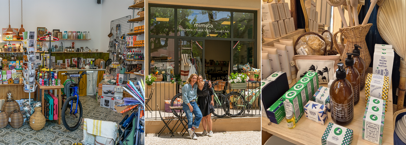 After 2 years as a successful café/brocante, Mimosa is changing course and moving just off rue Quaranta, to the former Louis Blanc school, rehabilitated by the town council into a village square housing 7 new essential shops.Mimosa welcomes you to a whole new world: modern drugstore, bicycle café and social club.