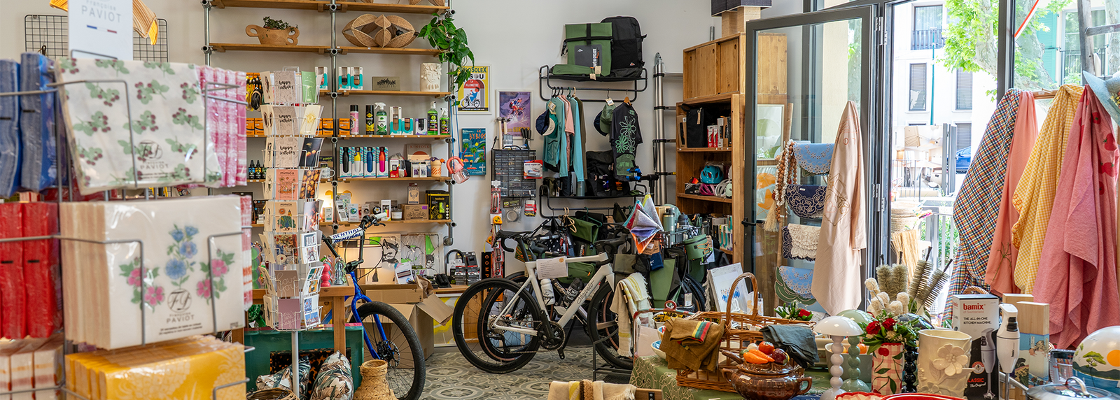 90m2 of products for the home, tableware, household linen, haberdashery, garden items, bicycle accessories, coffee and fresh juices to take away. A unique living space that friends Elsa Martin and Elodie Leroy have designed in their own image, animated by creative workshops and multi-generational social gatherings. (Yoga classes in the courtyard, ceramics, sewing, social rides, etc.).