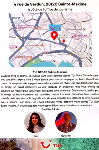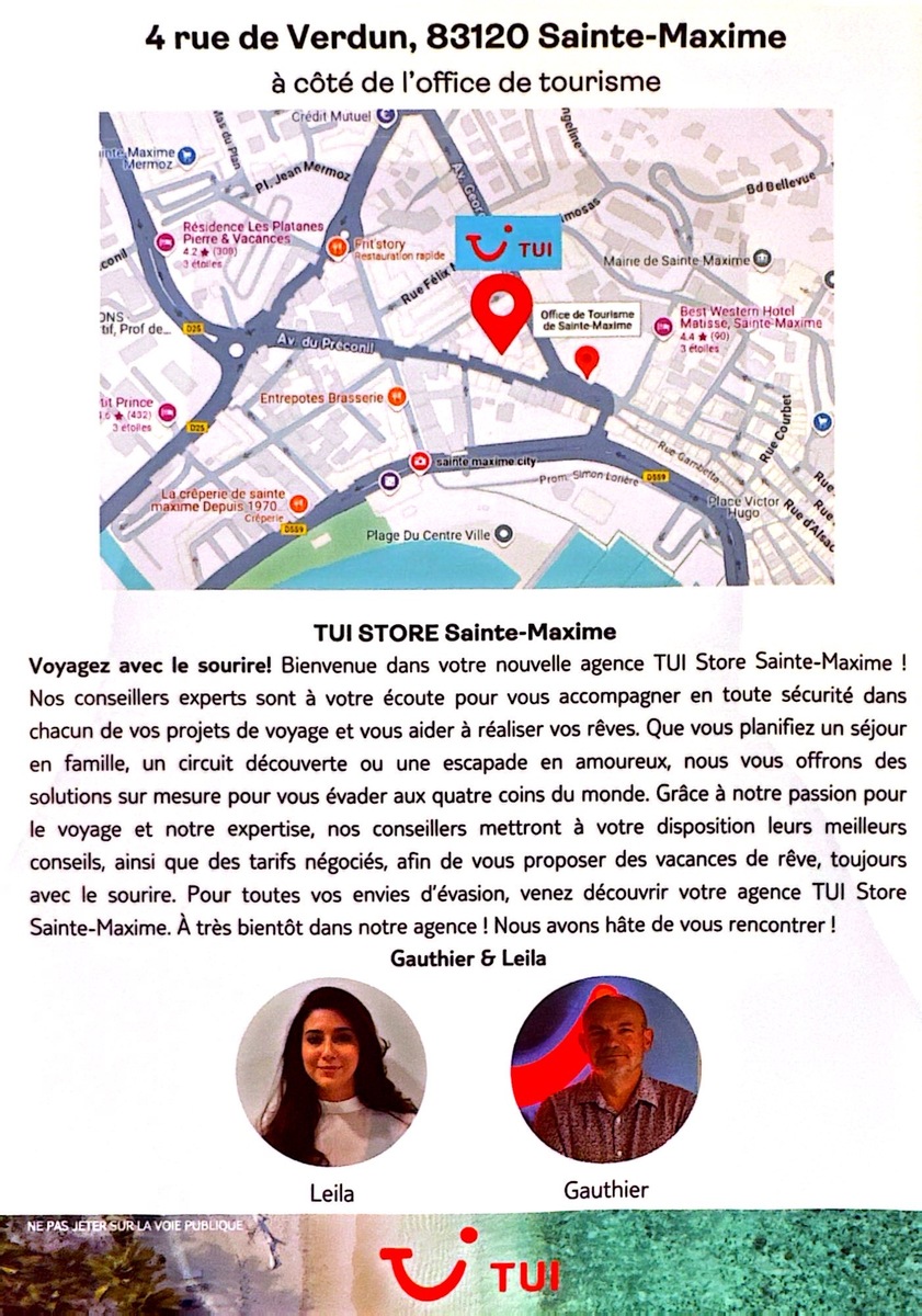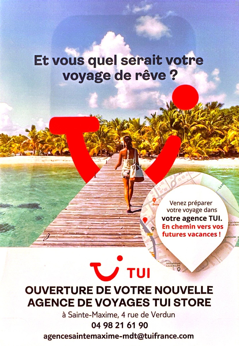 The travel company TUI specialises in designing customised vacations. Its Sainte-Maxime location is at 4 rue de Verdun, 83120 Sainte-Maxime. Whether it's a hotel, club, tour, or cruise, the team of knowledgeable consultants will assist you in planning your holiday. They can accommodate all your demands, whether you're travelling alone, with friends, as a couple, or as a family, on a tight or large budget, or just to explore, meet new people, or just unwind.