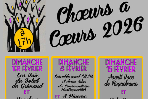 Dans le cadre des Rencontres Chorales "Chœurs à Cœurs", l'association Assaga propose trois concerts à l'église de La Garde Freinet en février 2026.