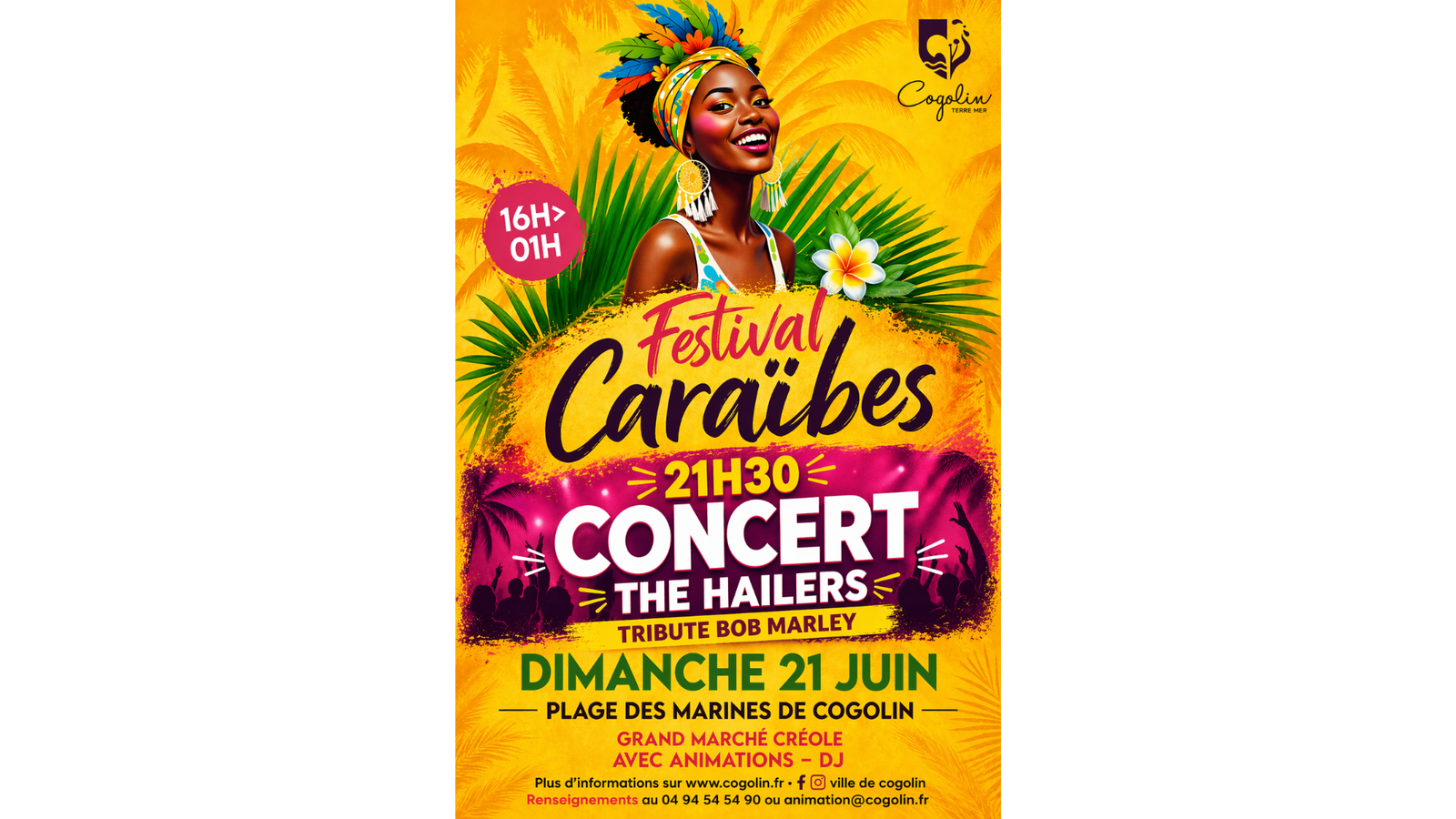 Le festival Caraïbes propose un grand marché créole avec animations et DJ, suivi d'un concert de The Hailers à 21h30, un groupe hommage à Bob Marley.