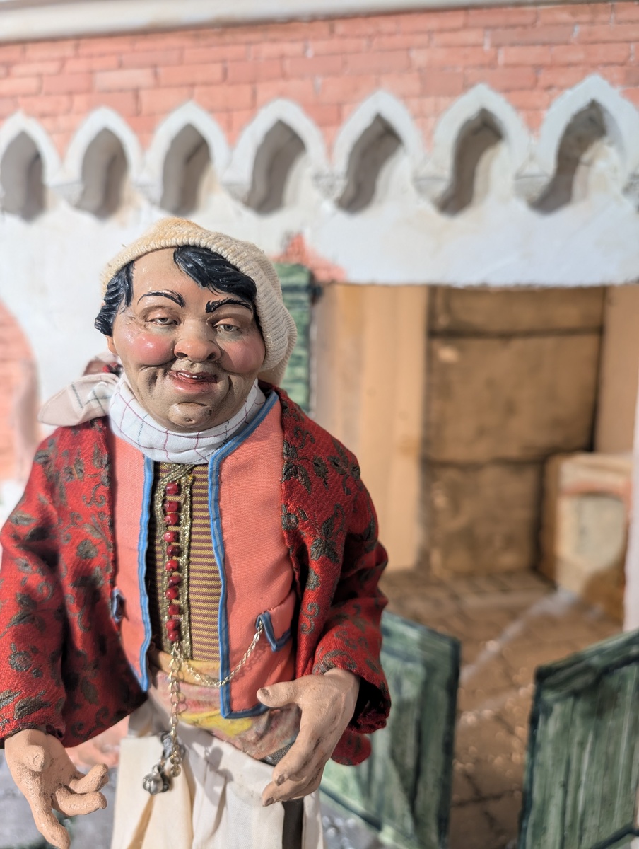 Les santons apparaissent dans un décor en profondeur par l’habile organisation de la perspective et du clair-obscur. Les figures typiques émergent : la beauté Procidienne, le noble, les bergers, le goitreux évoluent dans les scènes de la vie quotidienne de cette époque…