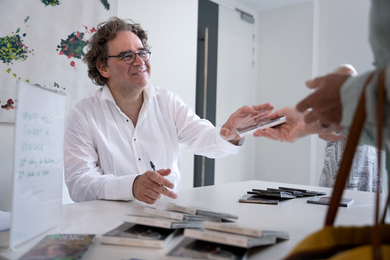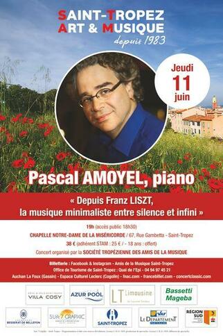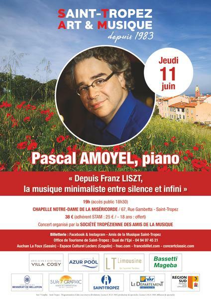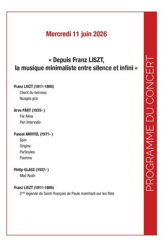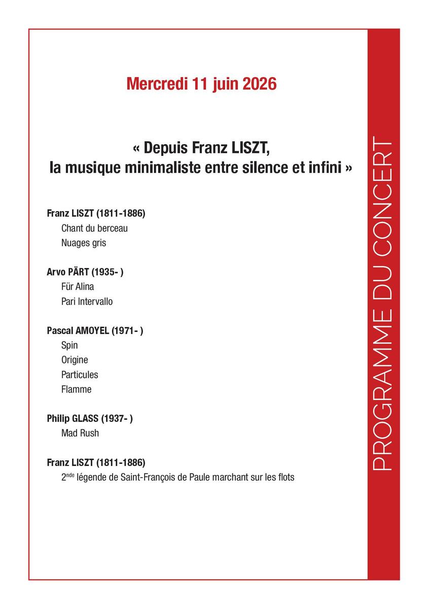 Concert du pianiste Pascal Amoyel : entre des œuvres de Liszt en ouverture et clôture, il interprète des pièces minimalistes d’Arvo Pärt (Für Alina, Pari Intervallo), Philip Glass (Mad Rush) et ses propres compositions (Spin, Origine, Particules, Flamme).